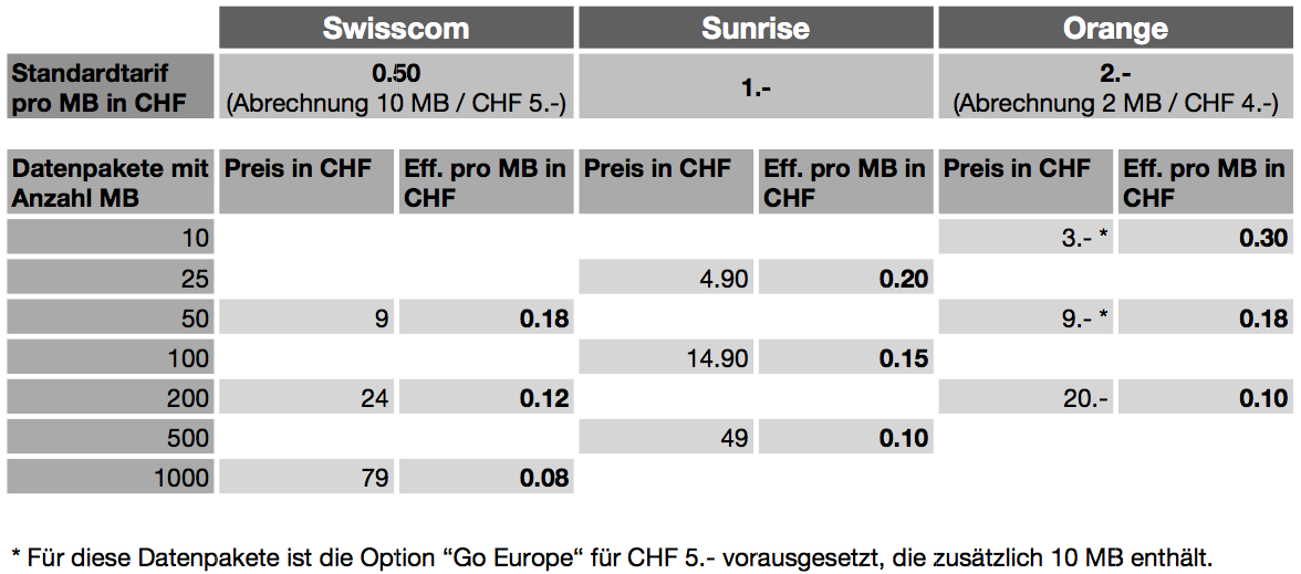 UPC verlangt mit 50 Rappen pro Megabyte am wenigsten. Swisscom bietet theoretisch auch den selben Tarif an, die Nutzung wird jedoch in 10 MB-Schritten zu CHF 5.- abgerechnet, wodurch in den wenigsten Fällen der selbe Tarif erreicht wird. Sunrise verlangt CHF 1.- und Orange CHF 2.- (Abrechnung in 2 MB-Schritten zu CHF 4.-).
