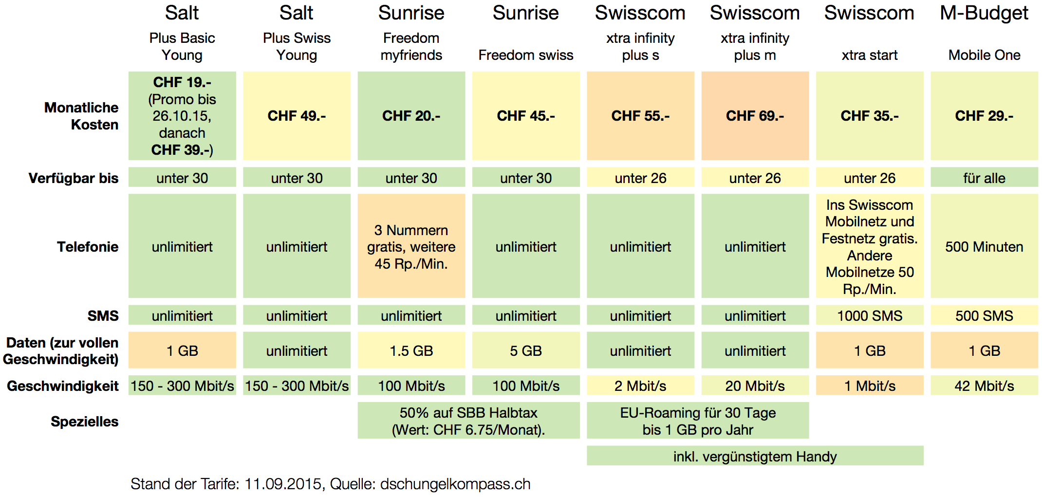 Um die verschiedenen Jugendabos miteinander zu vergleichen, hat dschungelkompass die ähnlichsten Angebote von Swisscom, Sunrise und Salt nebeneinander gestellt.