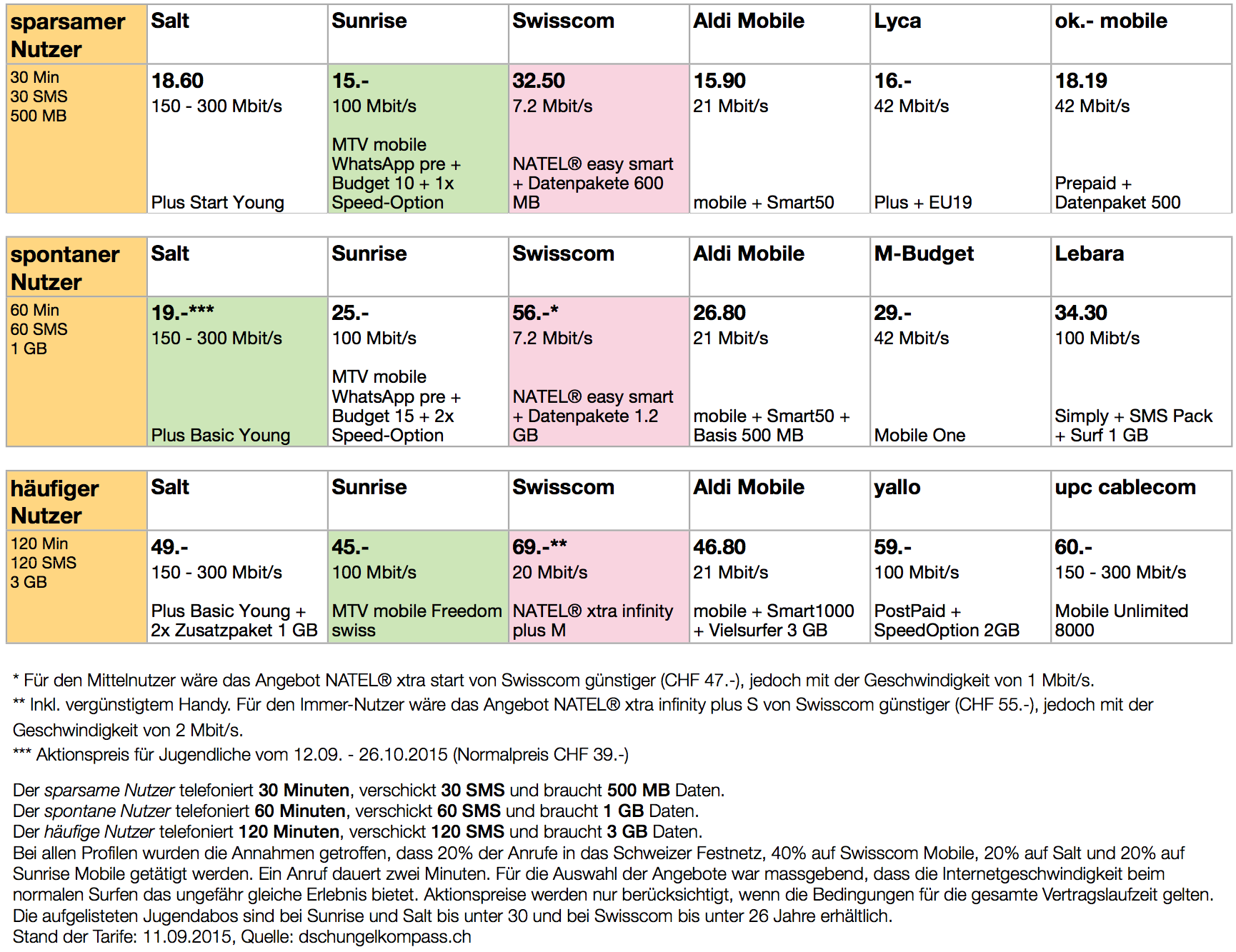 Der sparsame Nutzer findet bei Sunrise mit CHF 15.- das günstigste Prepaid. Hier wäre die neue Aktion von Salt mit CHF 4.- leicht teurer. Zwischen diesen Angeboten positionieren sich noch Aldi Mobile, Lyca und ok.- mobile.