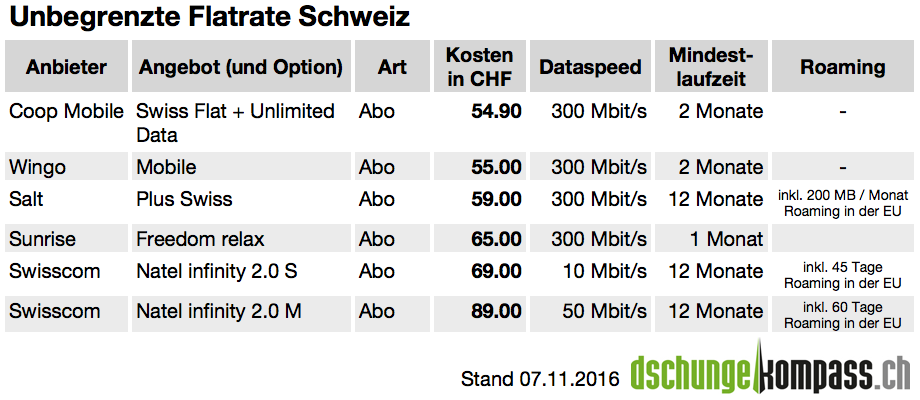 Ein Überblick der aktuelle erhältlichen Abos mit unbegrenzter Nutzung innerhalb der Schweiz: