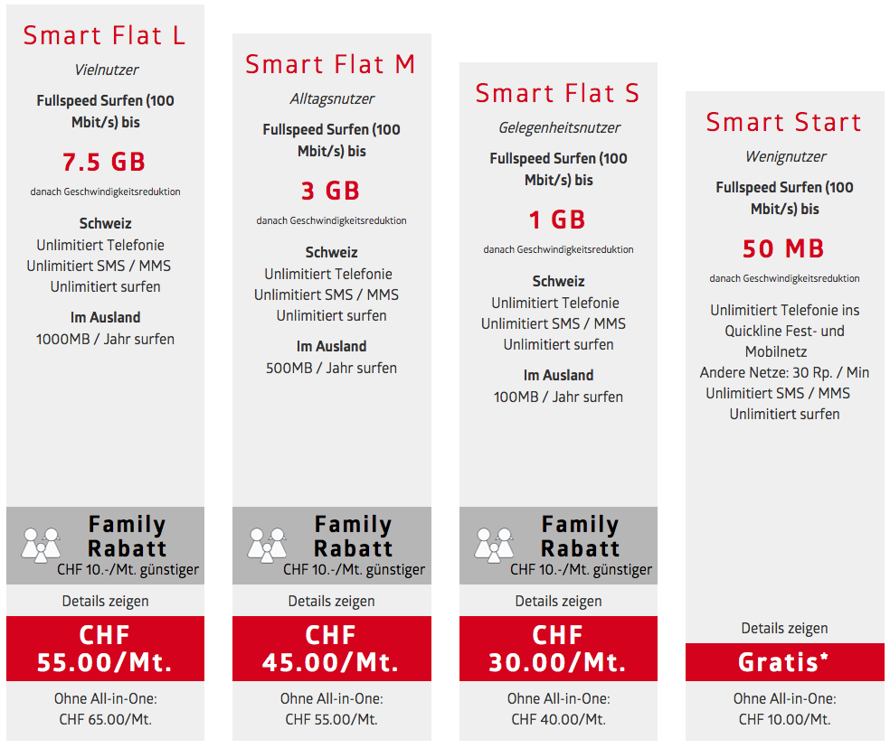 Neben dem bisherigen Kombi-Rabatt von CHF 10.-, wenn gleichzeitig auch ein All-In-One-Abo besteht, wurde ein neuer Family-Rabatt eingeführt. Ab dem zweiten Smart-Flat-Abo pro Haushalt wird ein Rabatt von CHF 10.- gewährt. In Kombination mit dem All-In-One Komirabatt beträgt er CHF 20.- pro Mobile-Abo. Pro Vertrag sind maximal vier Abos Rabatt berechtigt. Das Angebot gilt für Neukunden wie auch für Bestandskunden. Als schweizweit einziger Anbieter gewährt Quickline den Family-Rabatt auch ohne Kombipaket.