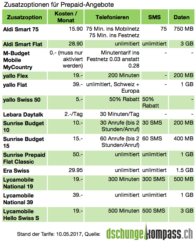 Wer täglich nicht mehr als ein Gespräch tätigt und mit 200 MB Daten auskommt, findet eine solche Zusatzoption bei Sunrise für CHF 10.- pro Monat. Wer unlimitiert telefonieren und nicht mehr als 3 GB Daten brauchen möchte, fährt z.B. mit Aldi Mobile für CHF 28.90 unter den Prepaid-Angeboten am günstigsten.