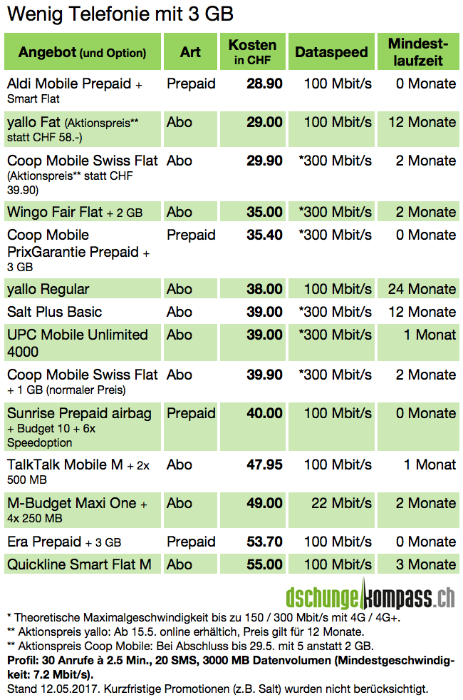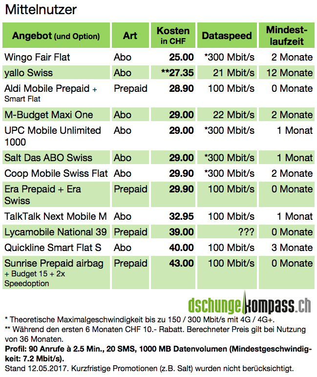 dschungelkompass hat mit Benutzerprofilen die Kosten für die günstigsten Prepaid und Abos berechnet. Auf der Tabelle des “Wenignutzers“ wird täglich ein Gespräch von 2.5 Minuten, monatlich 20 SMS und 300 MB Datenvolumen berechnet. Für diese Nutzung gibt es bei Sunrise bereits für CHF 15.- ein entsprechendes Angebot. Dies ist ein Prepaid mit der Zusatzoption “Budget 15“. Auch die weiteren vier Angebote bis CHF 22.50 sind Prepaid.