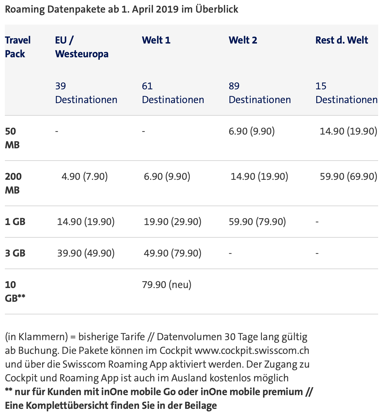 Swisscom kündigt heute in einer Medienmitteilung an, dass die Preise für Datenpakete weltweit ab dem 1.4.2019 gesenkt werden. Das Paket mit 1 GB in der EU wird z.B. um 25% gesenkt. Damit verlangt Swisscom nun weniger als Sunrise und Salt.