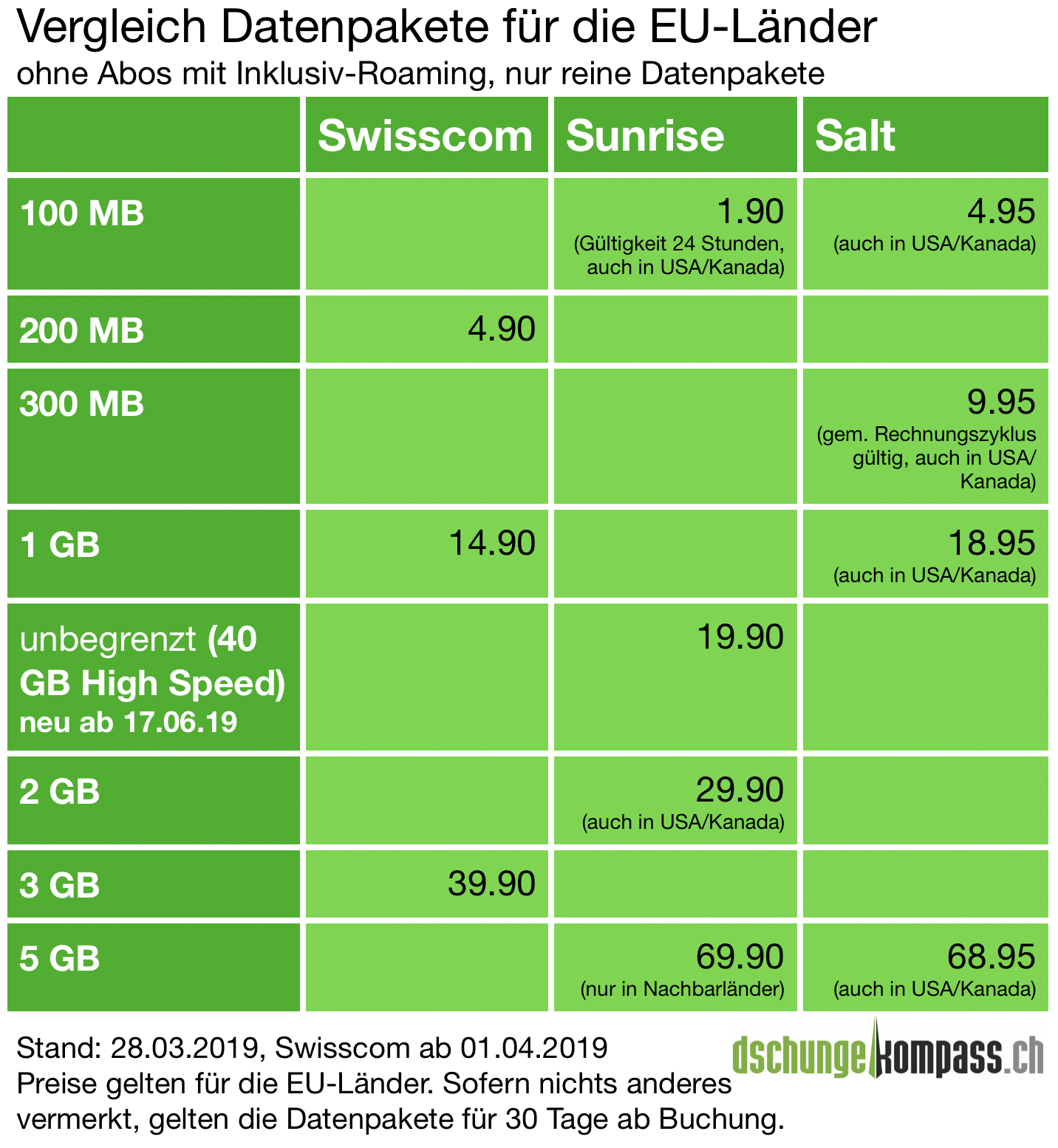 Bei der Swisscom kostet das 1 GB-Datenpaket mit CHF 14.90 nun am wenigsten. Salt verlangt CHF 18.95. Sunrise bietet ein 2 GB-Paket für CHF 29.90 an, was pro Gigabyte fast dem selben Preis wie dem der Swisscom entspricht. Der Vorteil bei Sunrise und Salt ist jedoch, dass dieser Preis auch für die USA/Kanada gilt. Für diese Länder kostet das 1 GB-Paket bei der Swisscom mit CHF 19.90 rund 30% mehr.