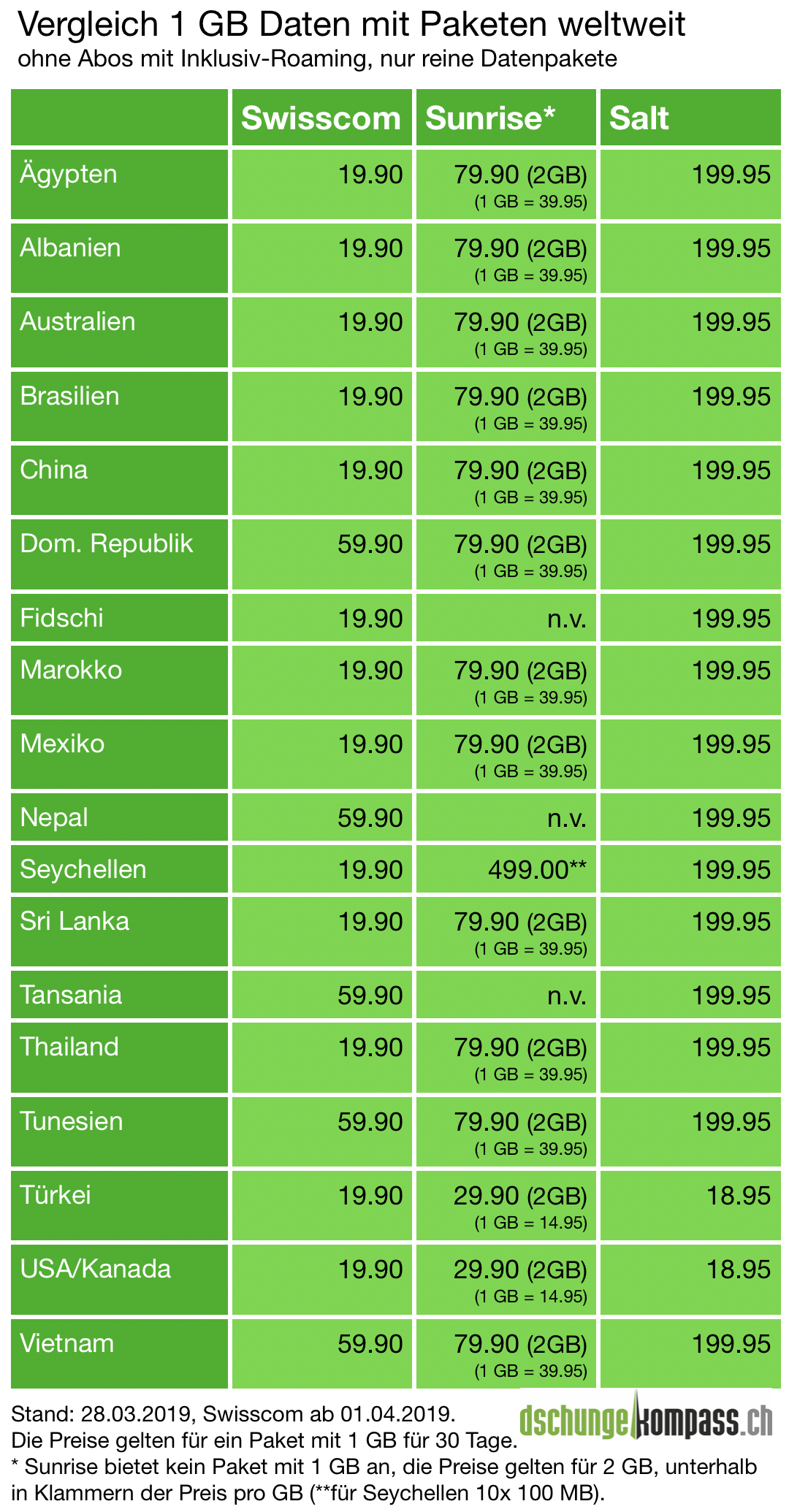 Mit der Ausnahme von der Türkei, USA/Kanada, Dominikanischen Republik, Tunesien und Vietnam bietet die Swisscom für 1 GB Datenroaming neu die günstigen Preise an. In den meisten Ländern kostet die selbe Datenmenge bei der Sunrise rund doppelt so viel, wie bei der Swisscom. (Da Sunrise kein Paket mit 1 GB anbietet, wurden die Preise von den Paketen mit 2 GB umgerechnet, für die Seychellen mit 100 MB.) Ein Vielfaches mehr verlangt Salt. Das Datenpaket mit 1 GB kostet ausserhalb der EU-Zone gegenwärtig CHF 199.-.