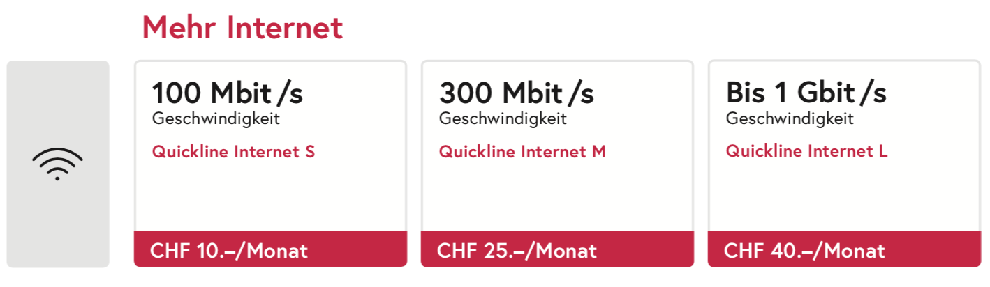 Wer schnelleres Internet wünscht, kann den Grundanschluss, der bereits 50 Mbit/s bietet, mit einem schnelleren Zusatz-Abo kombinieren. So kostet 100 Mbit/s zusätzlich CHF 10.-, 300 Mbit/s CHF 25.- oder bis zu einem Gigabit pro Sekunde CHF 40.-. Gemäss Anfrage sollte diese maximale Geschwindigkeit über alle direkten Glasfaser-Anschlüsse (FTTH) möglich sein. Bei Anschlüssen über das TV-Kabelnetz kann es sein, dass diese Geschwindigkeit nicht erreicht wird.