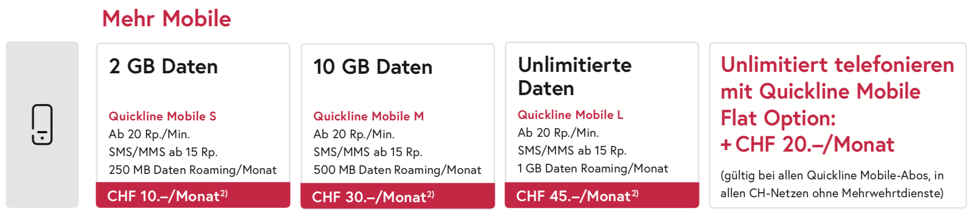 Die Handy-Abos bleiben unverändert, erhalten jedoch einen leicht anderen Namen. Aus z.B. «Smart Mobile S Basic» wird «Mobile S». Wie beim Festnetz, werden auch bei den Handy-Abos Anrufe mit 20 Rappen pro Minute verrechnet. Als Zusatz ist auch bei den Handy-Abos die Flatrate-Option erhältlich, die monatlich CHF 20.- kostet.