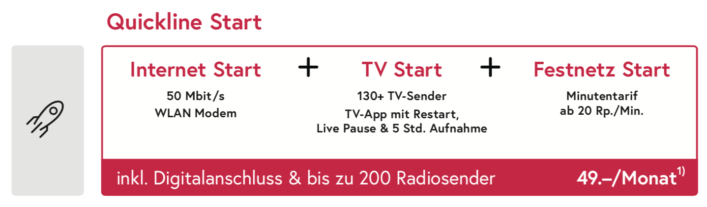 «Quickline Start» ist das neue Grundabo für CHF 49.-. Es enthält einen Internet-Anschluss mit WLAN-Modem mit 50 Mbit/s. Diese Geschwindigkeit sollte für die meisten Kunden bereits ausreichen. Dazu können 130 TV-Sender empfangen werden. In diesem Grundabo ist jedoch keine TV-Box mit Zusatzfunktionen enthalten. Die Sender können direkt über den TV mit DVB-C (Antennensignal) empfangen werden. Zusätzlich kann die Quickline TV-App genutzt werden. Neben dem Live-TV bietet sie zudem die Live-Pause, sowie 5 Stunden Aufnahmekapazität.