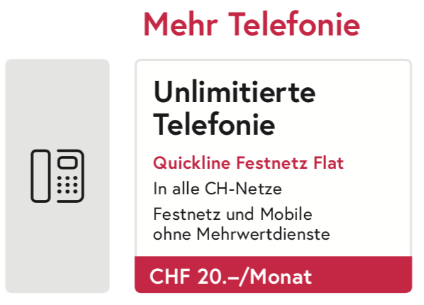 Wer viel über das Festnetz telefoniert, kann die Flatrate-Option für zusätzliche CHF 20.- abonnieren. Dadurch werden Anrufe in die Schweizer Fest- und Mobilnetze nicht verrechnet.