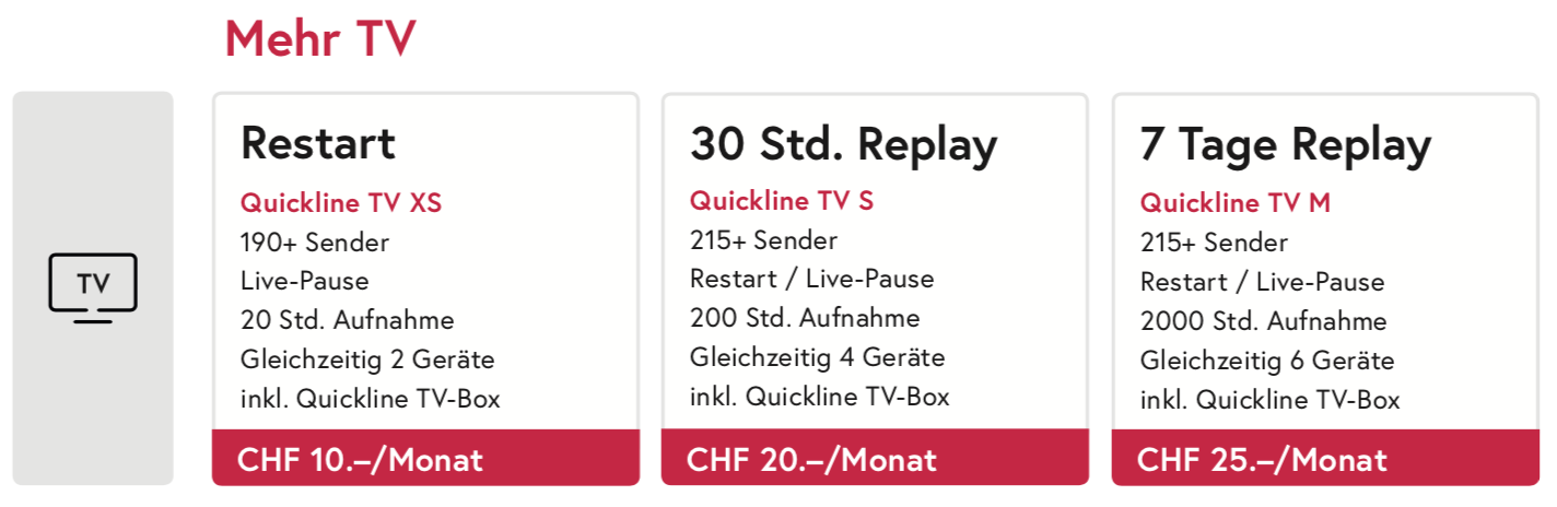 «TV XS» bietet für den Aufpreis von CHF 10.- u.a. eine Aufnahmefunktion (20 Stunden). «TV S» kostet CHF 20.- und bietet bereits eine Aufnahmekapazität von 200 Stunden. Enthalten ist auch eine Replay-Funktion (30 Stunden zurück). Für den Aufpreis von CHF 25.- ist «TV M» erhältlich. Dieses Zusatzabo bietet u.a. 2000 Stunden Aufhahme und 7 Tage Replay.