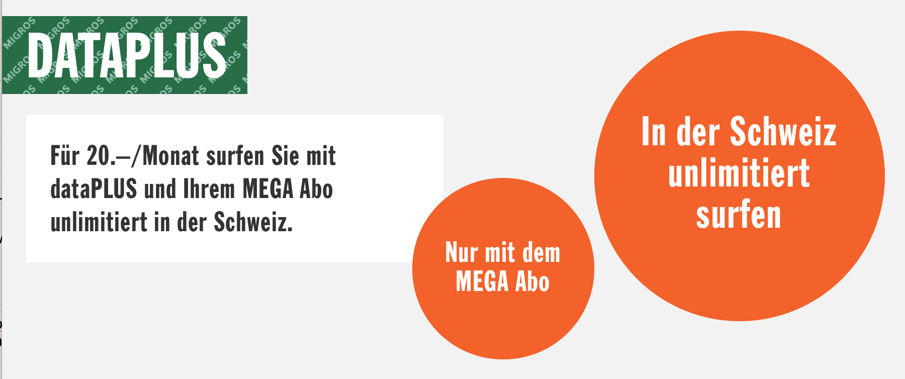 Neu ist die Datenoption «dataPlus» für monatliche CHF 20.- erhältlich. Sie enthält unlimitiertes Datenvolumen innerhalb der Schweiz. Allerdings ist diese Option nur dem grössten Handy-Abo von M-Budget «Mega» vorenthalten. Dieses Handy-Abo «Mega» enthält unlimitierte Minuten innerhalb der Schweiz, wie auch aus der Schweiz in die Mobil- und Festnetze von Deutschland, Frankreich, Italien, Österreich, Spanien und Portugal. Zudem enthält das Abo monatlich 5 GB Datenvolumen. Bevor diese neue Option lanciert wurde, kostete das Abo während den ersten 6 Monaten CHF 29.-, danach CHF 39.-. Durch die neue Option ist dieser Rabatt verschwunden und das Abo kostet von Anfang an CHF 39.-. Während der Einführungsaktion ist «dataPlus» (bei Neubestellung vom Abo Mega bis 10.05.2021) für ein Jahr kostenlos dabei.