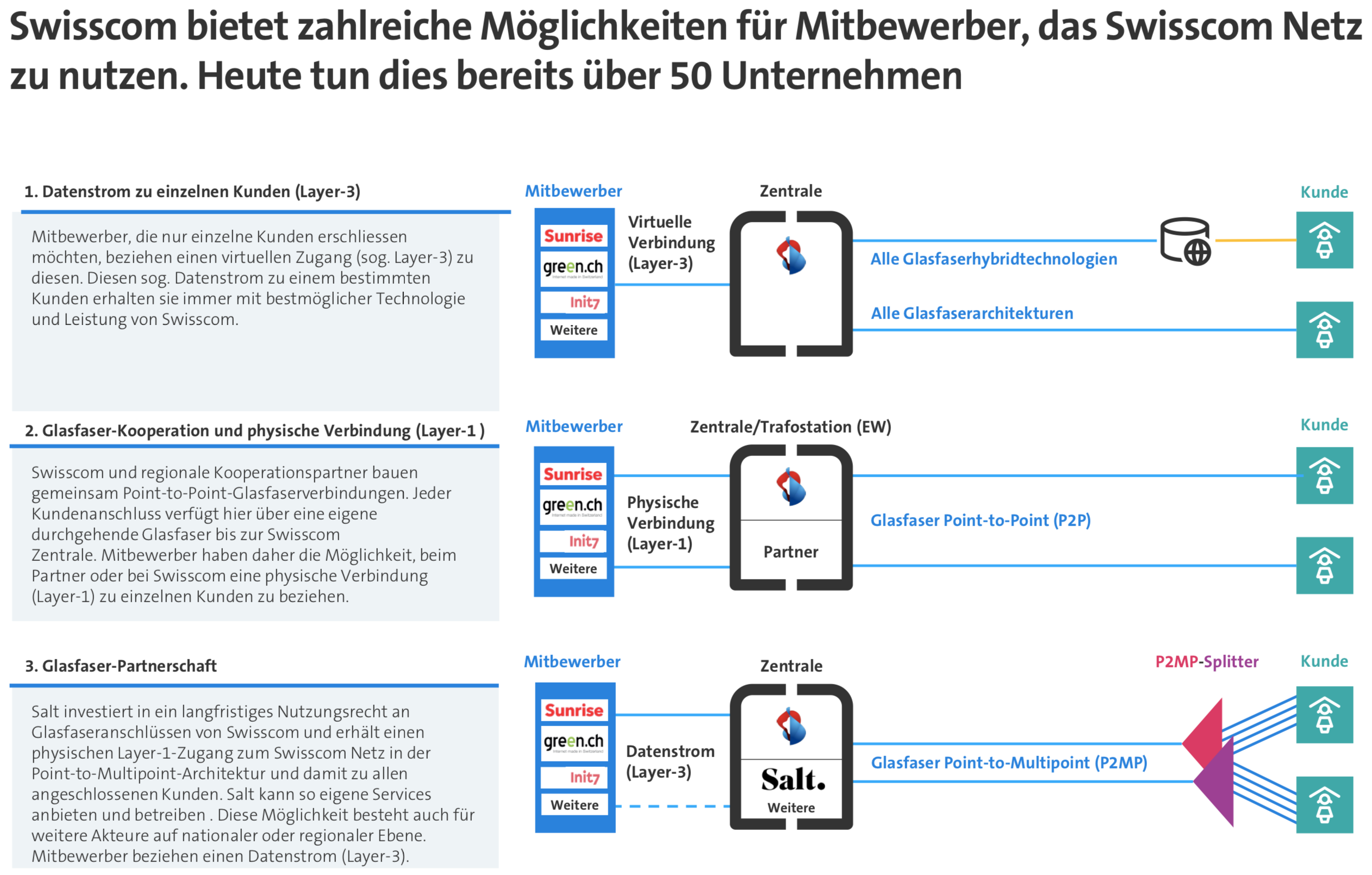 Die Glasfaser-Partnerschaft baut auf einer bestehenden Geschäftsbeziehung zwischen den beiden Unternehmen auf: Salt nutzt für Privatkundenangebote bereits seit mehreren Jahren einen physischen Layer-1-Zugang zu Swisscom Glasfasern in der Point-to-Point-Architektur. Im Rahmen der Glasfaser-Partnerschaft investiert Salt in ein langfristiges Nutzungsrecht an Glasfaseranschlüssen von Swisscom und beteiligt sich so an den hohen Netzinvestitionen und den dazugehörigen Geschäftsrisiken. Damit verfügt das Unternehmen nun auch in Swisscom FTTH-Glasfasernetzen in der Point-to-Multipoint-Architektur, die Swisscom seit 2020 gebaut hat und bis 2025 noch ausbaut, über einen eigenen physischen Layer-1-Zugang, auf dem Salt eigene Services anbieten und betreiben kann. Swisscom trägt weiterhin die Gesamtverantwortung für die Netzplanung, den Netzausbau sowie den Unterhalt und bleibt Eigentümerin der Infrastruktur.