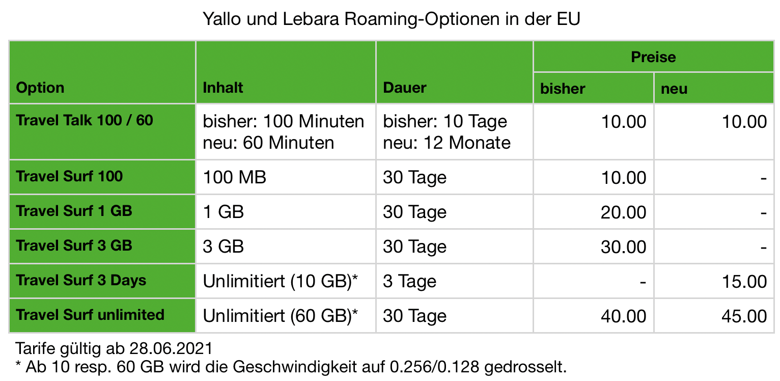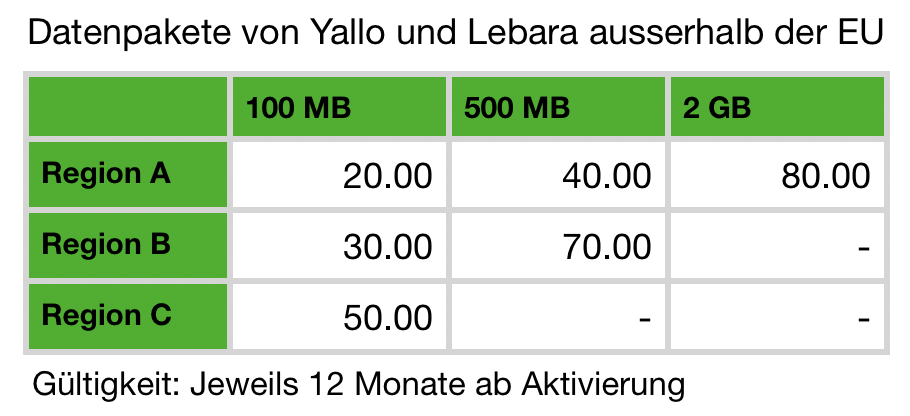 Die bisherigen Datenpakete mit 100 MB, 1 oder 3 GB und der Laufzeit von 30 Tagen sind bei Yallo und Lebara nicht mehr erhältlich. Neu gibt es nur noch unlimitierte Flatrate-Optionen. Dabei kostet die Option für 3 Tage CHF 15.- oder für 30 Tage CHF 45.-. Diese Monatsoption war bereits zuvor erhältlich, kostete aber CHF 5.- weniger.