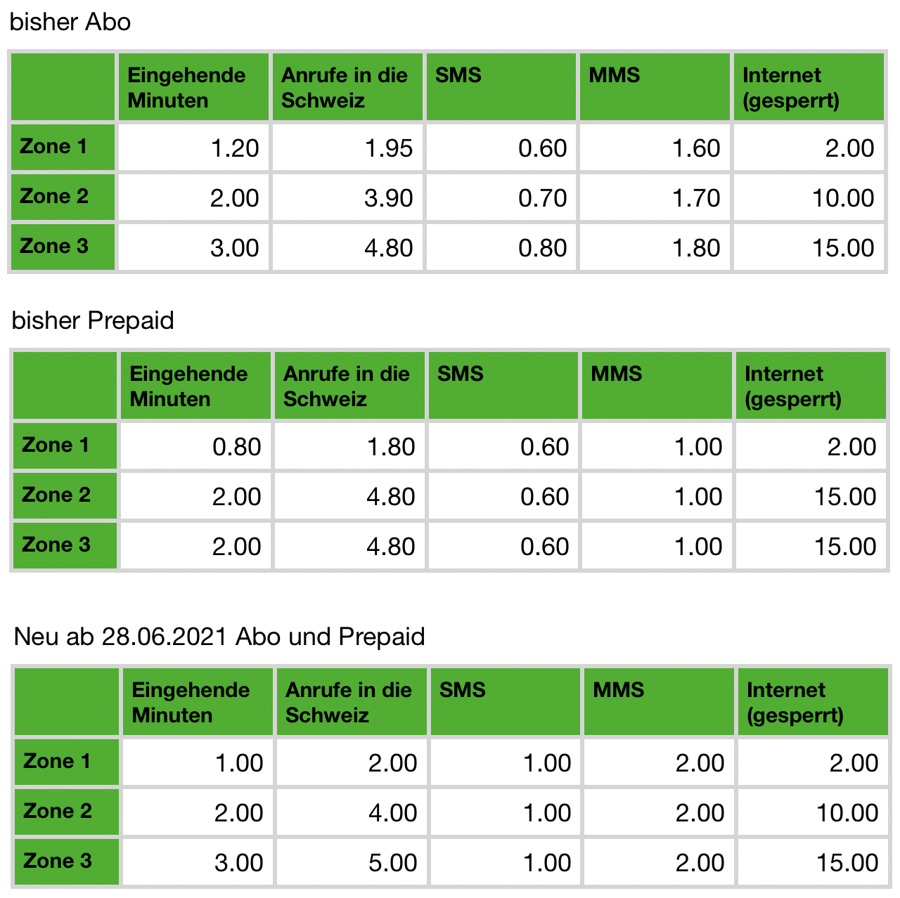 Die eingehende Minute in der EU kostet neu CHF 1.-, zuvor waren es für Abo-Kunden CHF 1.20 und für Prepaid 80 Rappen. Für Anrufe aus der EU in die Schweiz wird der Minutentarif für Abos um 5 und für Prepaid um 20 Rappen auf neu CHF 2.- angehoben. Auch die SMS werden mit CHF 1.- pro gesendetes SMS teurer. Zuvor betrug dieser Tarif 60 bis 80 Rappen.
