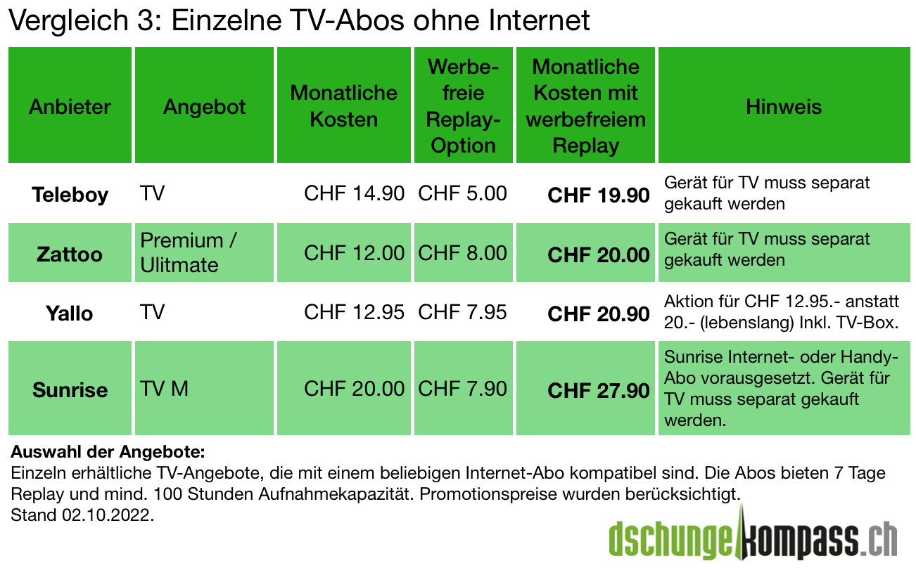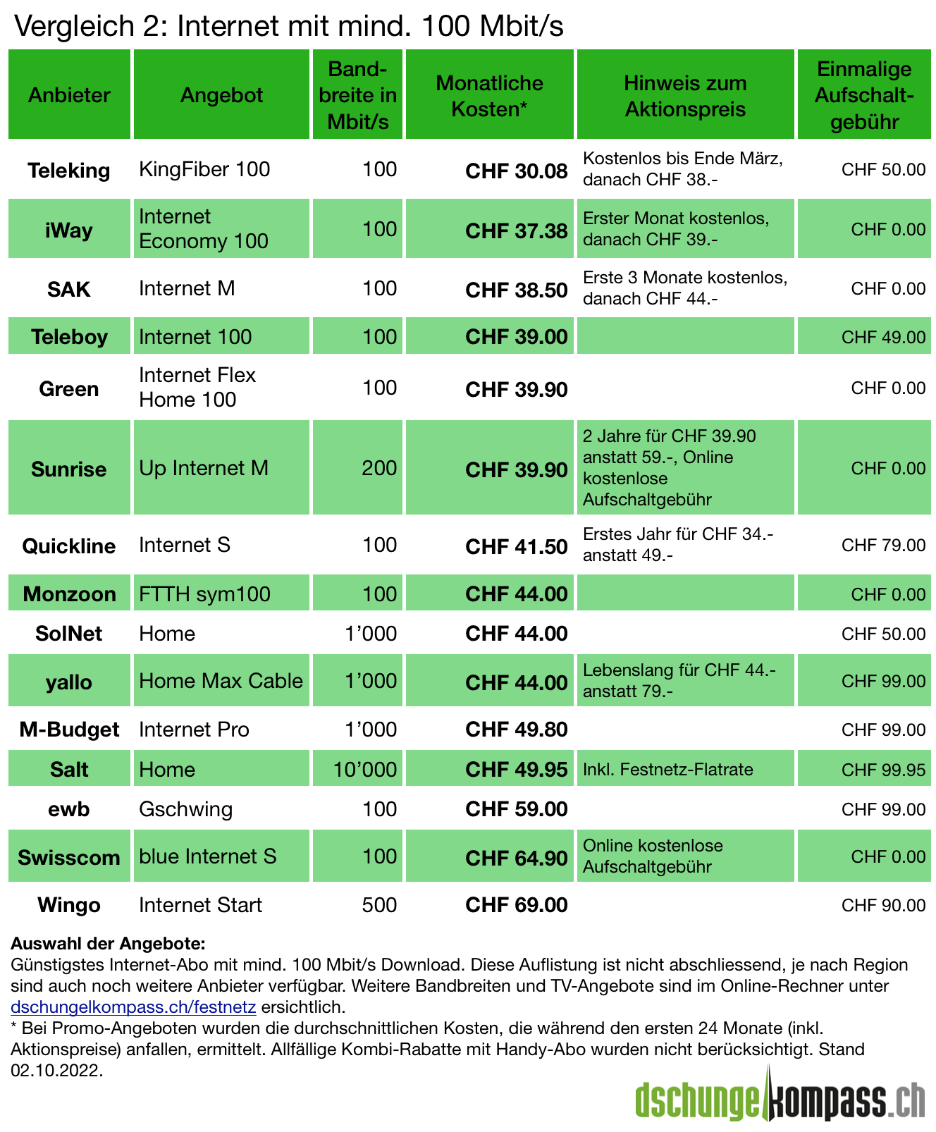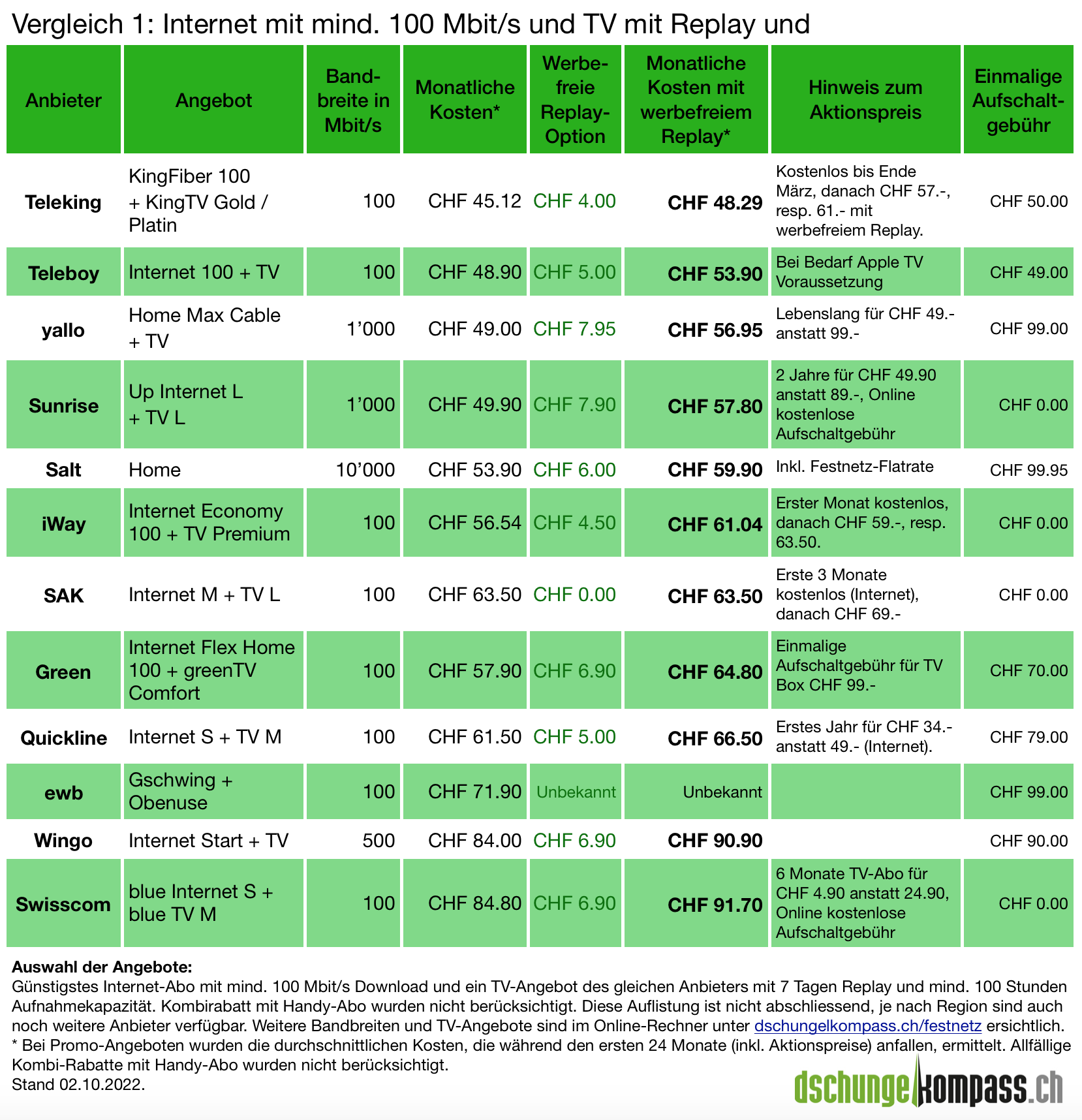 Das günstigste Angebot (ohne Promotionspreis) stammt von Teleboy für CHF 53.90. Hier ist jedoch zu berücksichtigen, dass auf das TV-Angebot nur über Apps zugegriffen werden kann. Ist der Fernseher nicht kompatibel, so kann z.B. ein Apple TV separat erworben werden. Das Angebot von Teleking würde CHF 61.- kosten, bis Ende März (gut 5 Monate) ist es jedoch kostenlos, was einen Durchschnittspreis von CHF 48.29 ergibt. Bei Yallo fallen durch ein Aktionsangebot die dauerhaft gültigen Kosten von CHF 56.95 an. Das günstigste Angebot von Sunrise kostet während den ersten 24 Monaten CHF 57.80, anstatt 96.90. Salt verlangt CHF 59.90, zusätzlich ist jedoch noch eine Festnetz-Flatrate enthalten. Bei iWay kostet das Angebot CHF 63.50, der erste Monat ist kostenlos. Bei SAK kostet dies CHF 69.- die ersten drei Monate des Internet-Abos sind kostenlos. Das ausgewählte Angebot von Green kostet CHF 64.80. Bei Quickline fallen die monatlichen Kosten von 74.- an, durch die Einführungsaktion sind es während den ersten zwei Jahren CHF 66.50. Wingo verlangt CHF 90.90. Bei Swisscom beträgt der reguläre Preis CHF 96.70, durch ein Aktionsangebot sind es während zwei Jahren CHF 91.70.