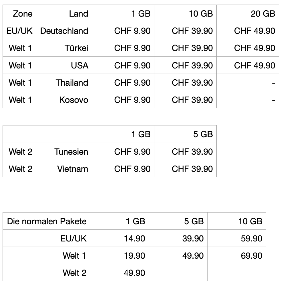 So ist z.B. in der USA, in Deutschland und in der Türkei neu ein Datenpaket mit 20 GB für CHF 49.90 erhältlich. Bisher beinhaltete das grösste Datenpaket in der Zone «EU/UK» 10 GB für CHF 59.90, in der Zone «Welt 1» CHF 69.90. In Tunesien und Vietnam sind neu Datenpakete mit 1 GB für CHF 9.90 (anstatt dem Zonen-Preis von CHF 49.90) oder 5 GB für CHF 39.90 erhältlich.