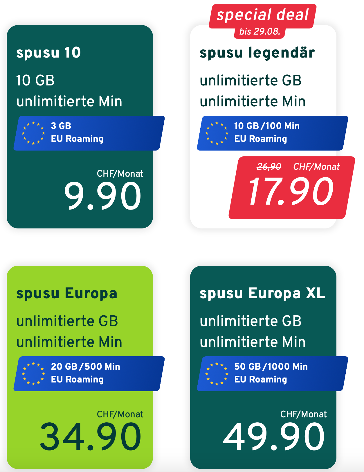 Spusu gibt es seit 10 Jahren und hat in Österreich gemäss eigenen Angaben bereits 600’000 Kundinnen und Kunden gewonnen. Nun sind vier Handy-Abos für den Schweizer Markt erhältlich. Ein Abo mit unlimitiertem Telefonieren, sowie 10 GB im Inland und davon 3 GB in der EU ist ab CHF 9.90 erhältlich.