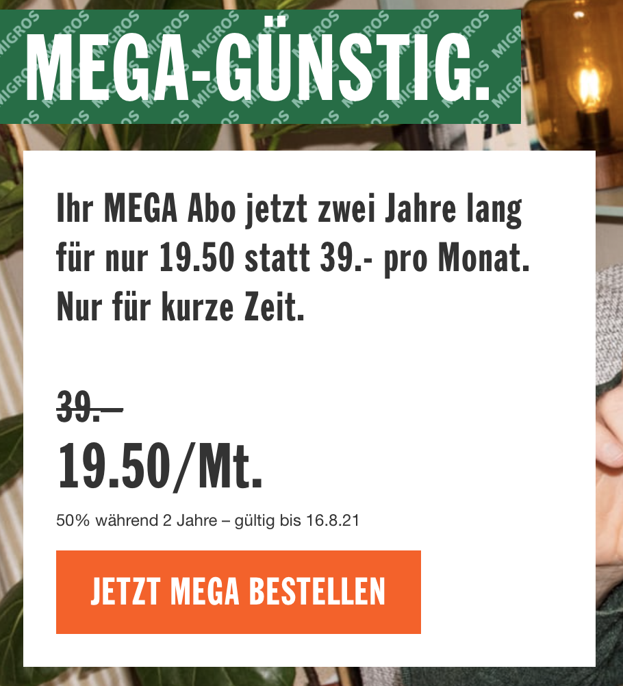 Neukunden erhalten das M-Budget Handy-Abo «Mega» derzeit für CHF 19.50 anstatt 39.-. Dieser Preis gilt für 24 Monate.
