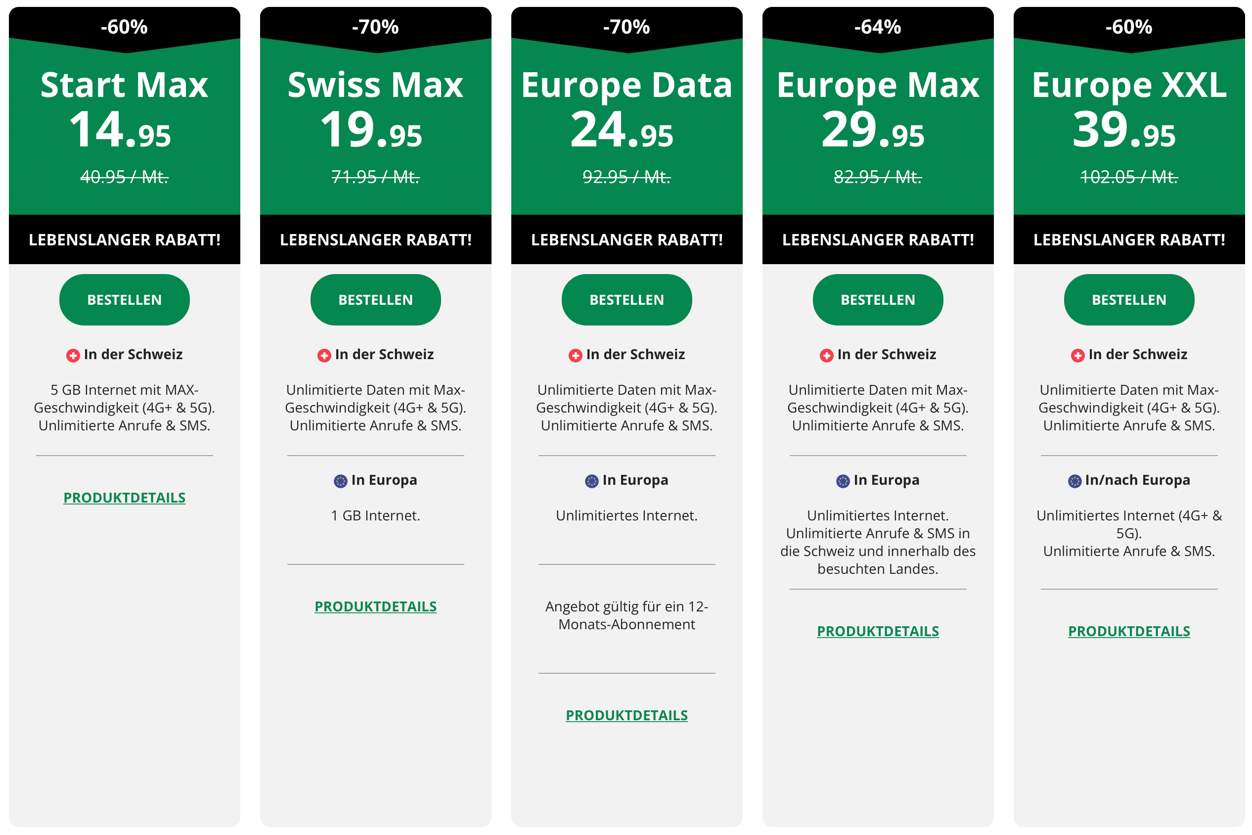 - Unlimitiertes Datenvolumen für Roaming in der Europa-Zone (nach 40 GB wird die Geschwindigkeit auf 0.256 Mbit/s gedrosselt)