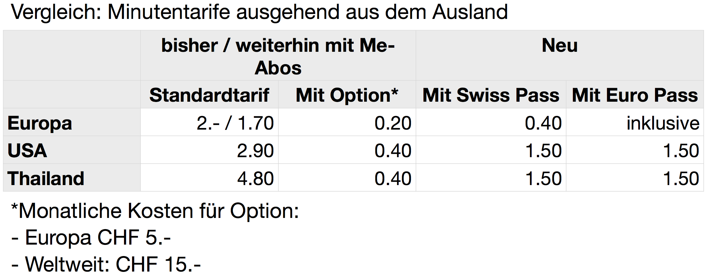 Wer keine Roaming-Option gelöst hatte, bezahlte für ein Gespräch von Spanien in die Schweiz CHF 2.- pro Minute. Bei "Swiss Pass" von Salt wurde der Minutentarif standardmässig auf 40 Rappen gesenkt. Ausserhalb von Europa beträgt der Minutentarif neu CHF 1.50, bei Orange bis zu CHF 4.80. Die Datentarife bleiben unverändert. Ein Paket mit 200 MB kostet in Europa CHF 20.-, ausserhalb CHF 100.-.