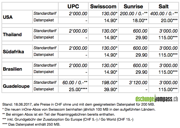 Hier punktet UPC nur noch in Guadeloupe, da es gemäss Zoneneinteilung auch zur EU gehört und somit auch die Europa-Abos ohne Zusatzkosten genutzt werden können. Für die anderen vier Beispielländer gilt der Tarif von CHF 10.- pro Megabyte, Datenpakete sind leider nicht erhältlich. Der Standardtarif pro Megabyte wird jedoch in vier Ländern von Salt mit CHF 15.- übertroffen, sofern kein Datenpaket gelöst wird. Für Reisen ausserhalb der EU eignen sich also Abos der drei anderen Anbieter mehr.