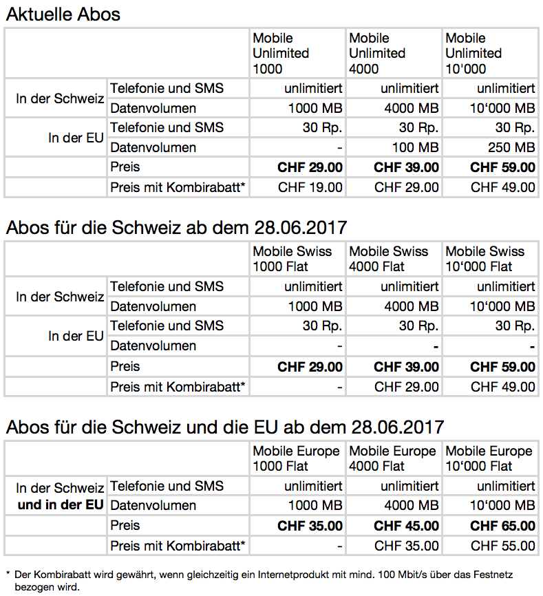 Gemäss heutiger Mitteilung wird UPC ab dem 28.06.2017 neue Handy-Abos lancieren. Der Clou dabei ist, dass die neuen Abos im ganzen EU-Raum gleich genutzt werden können, wie innerhalb der Schweiz. Damit gestaltet UPC ihre neuen, zusätzlichen Europa-Handy-Abos nun gleich wie die Anbieter in der EU. Mit den neuen Abos kann nun innerhalb der EU unlimitiert telefoniert und gleich viel Datenvolumen genutzt werden, wie man es sich innerhalb der Schweiz gewohnt ist. Dies ist eine Schweizer Premiere.