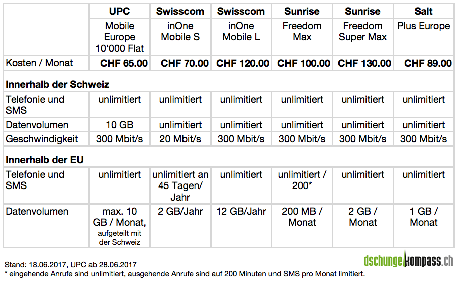 Aufgrund der verschiedenen Eigenschaften wie Datenvolumen und Surfgeschwindigkeit, Roamingguthaben, Standardtarifen, Zusatzoptionen und Datenpaketen gestaltet sich ein direkter und vor allem vollständiger Vergleich in Tabellenform immer schwieriger. Dschungelkompass bietet den einzig vollständigen Tarifrechner der Schweiz an, der unter Einbezug von allen Tarifen und Flatrate-Eigenschaften für die Schweiz, ins Ausland oder im Ausland (Roaming) für jedes Land und jedes erdenkliche Nutzungsprofil die Kosten aller Schweizer Angebote berechnen kann. Die Nutzung ist kostenlos und zeigt alle Möglichkeiten mit Zusatzoptionen an.