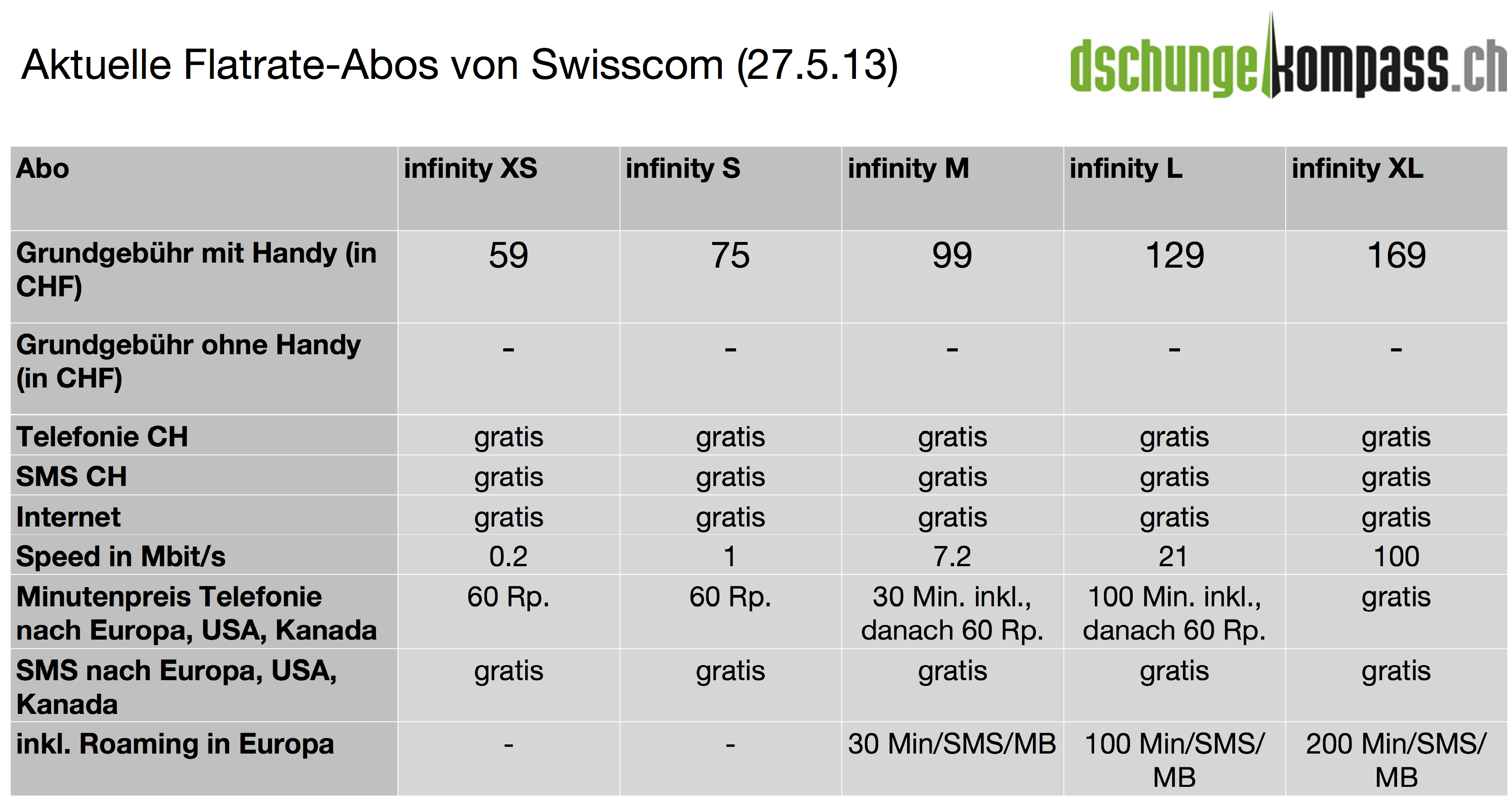 Der grösste Unterschied der einzelnen Infinity-Abos bei Swisscom liegt in der Geschwindigkeit des mobilen Internets. Ab dem mittleren Abo (infinity M, CHF 99.-/Monat) sind zusätzlich Gratis-Minuten nach Europa, USA und Kanada, sowie Minuten, SMS und Megabytes fürs Roaming aus einigen Ländern von Europa enthalten. Je höher die Grundgebühr, je höher ist die Anzahl der inklusiven Einheiten. SMS von der Schweiz ins Ausland sind bei allen Infinity-Abos inklusive.