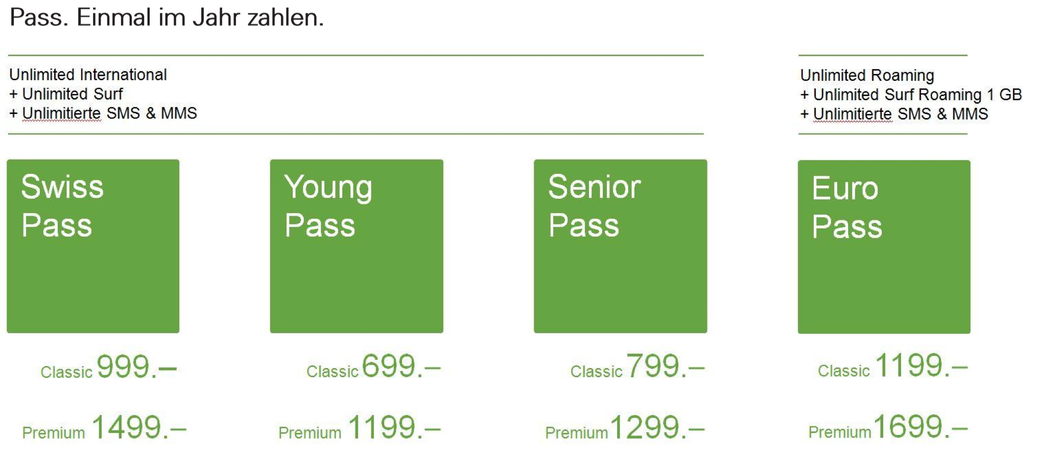 Dieses Abo enthält zum Swiss Pass zusätzlich eine Telefonie-, SMS- und MMS-Flatrate, sowie 1 GB Datenvolumen innerhalb von Europa. "Euro Pass" kostet ohne Gerät jährlich CHF 1199.-, resp. knapp 100 Franken pro Monat. Mit einem neuen Gerät kostet es jährlich CHF 500.- mehr. Für dieses Abo erhalten Jugendliche und Senioren keinen Rabatt.