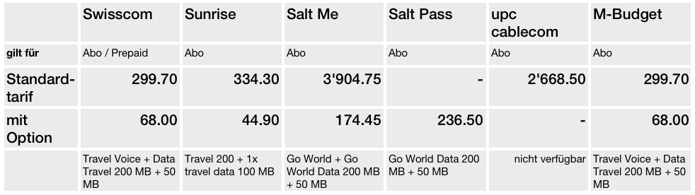 Ein Beispielkunde, der zwei Wochen in den USA ist, 10 Anrufe entgegennimmt, 20 Anrufe auf Schweizer Anschlüsse, vier in den USA tätigt (1-2 Minuten je Anruf), 15 SMS verschickt und 250 MB Daten (Internet) verbraucht, bezahlt bei jedem Anbieter mit entsprechender Option im Vergleich zum Standardtarif ein Vielfaches weniger, wie die folgende Tabelle aufzeigt: