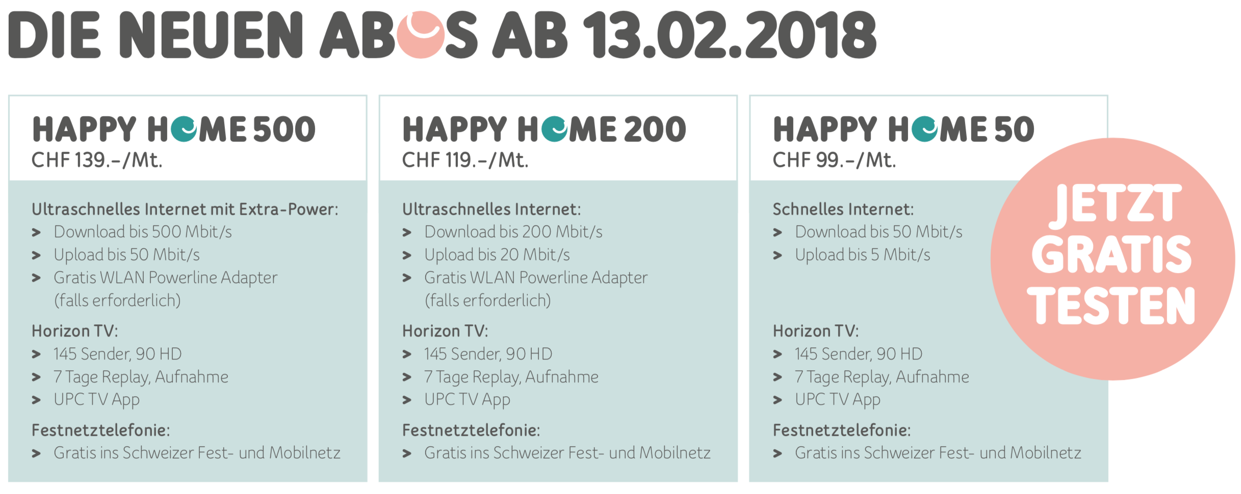 Nach wie vor sind die TV- und Internet-Abos von UPC in drei verschiedenen Varianten erhältlich. Der eigentliche Unterschied ist die Geschwindigkeit des Internets und der monatliche Abopreis. Jedes dieser Abos ist in drei verschiedenen Ausführungen erhalten. Die günstigste Variante enthält einen Festnetztelefonanschluss mit Gebühren, falls Gespräche geführt werden. Für CHF 10.- Aufpreis kann unlimitiert innerhalb der Schweiz (ins Fest- und Mobilnetz) telefoniert werden. Für nochmals CHF 10.- Aufpreis kann auch unlimitiert ins Festnetz der europäischen Länder telefoniert werden. Neu heissen sie Happy Home anstatt Connect&Play. Neu dazu gekommen ist ein WLAN Powerline-Adapter. Wer bisher nicht in allen Räumen der Wohnung WLAN-Empfang hatte, kann dies nun verbessern.