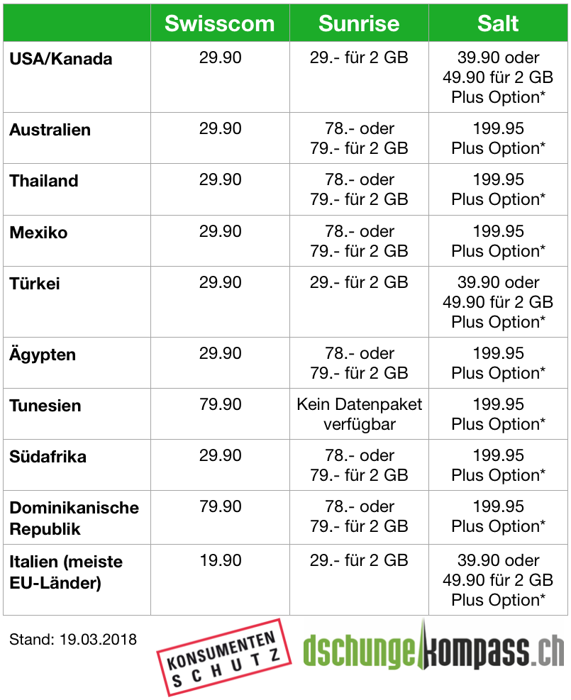 Update: Gemäss Medienstelle von Salt ist die Aussage falsch, dass bei einigen Abos (die über kein Roaming-Datenvolumen verfügen) die Optionen "Internet Europe/World" Voraussetzung sind, um weitere Datenpakete mit der Laufzeit von 30 Tagen buchen zu können. Auf der Webseite ist dies jedoch nicht klar ersichtlich. Der Satz auf www.salt.ch/roaming unterhalb von Extra Data: „Wenn Sie die Roaming-Daten Ihrer Internet-Option oder Ihres Abos aufgebraucht haben, können Sie jederzeit weitere Daten hinzufügen.“ und die Beschreibung bei Internet Europe: „Internet Europe wird nicht benötigt, wenn in Ihrem Abo bereits ein Roaming-Datenvolumen für Europa inbegriffen ist", liess den Ersteller des Vergleiches vermuten, das die ursprünglich angenommene Handhabung korrekt ist. Gemäss eigenem Test konnte Extra Data nicht hinzugefügt werden, da sie im Kunden-Account nicht angezeigt werden und der erwähnte Link http://costcontrol.salt.ch/status nicht funktionierte.
