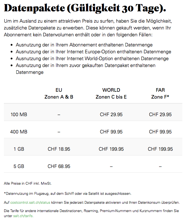 Das direkte Buchen der Datenpakete funktioniert mit allen Salt-Abos, die kein Datenvolumen für Roaming beinhalten. Bei den Roaming-Abos muss zuerst das im Abo inkludierte Datenvolumen aufgebraucht werden, bevor ein weiteres Datenpaket gebucht werden kann. Weitere Datenpakete können danach erst wieder gebucht werden, wenn das vorherige Paket aufgebraucht wurde.