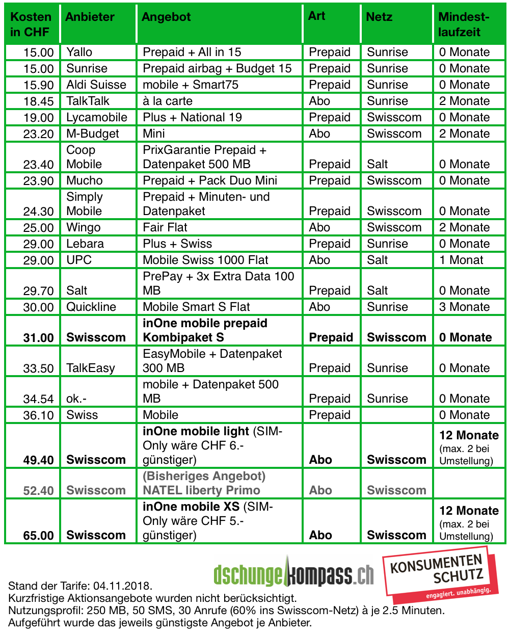 Eine Analyse von dschungelkompass.ch und dem Konsumentenschutz zeigt jedoch, dass die aussortierten Abos für die wenigsten Kunden optimal waren. Verallgemeinert lässt sich sagen, dass Wenignutzer mit Prepaid-Lösungen günstiger fahren und Mittel- oder Vielnutzer von neueren Abos mit relativ vielen inkludierten Leistungen profitieren würden. Dies lässt sich am Abo „Natel liberty primo“ – eines der Abos, das aussortiert wird - sehr gut zeigen: Dieses Abo hat eine monatliche Grundgebühr von 29 Franken, wobei 50 SMS und 250 MB Daten inbegriffen sind. Telefonanrufe (0 bis max. 60 min.) kosten 70 Rappen ins Swisscom- Netz, in fremde Netze (Sunrise, Salt) kostet ein Anruf (0 bis max. 60 min.) 90 Rappen.