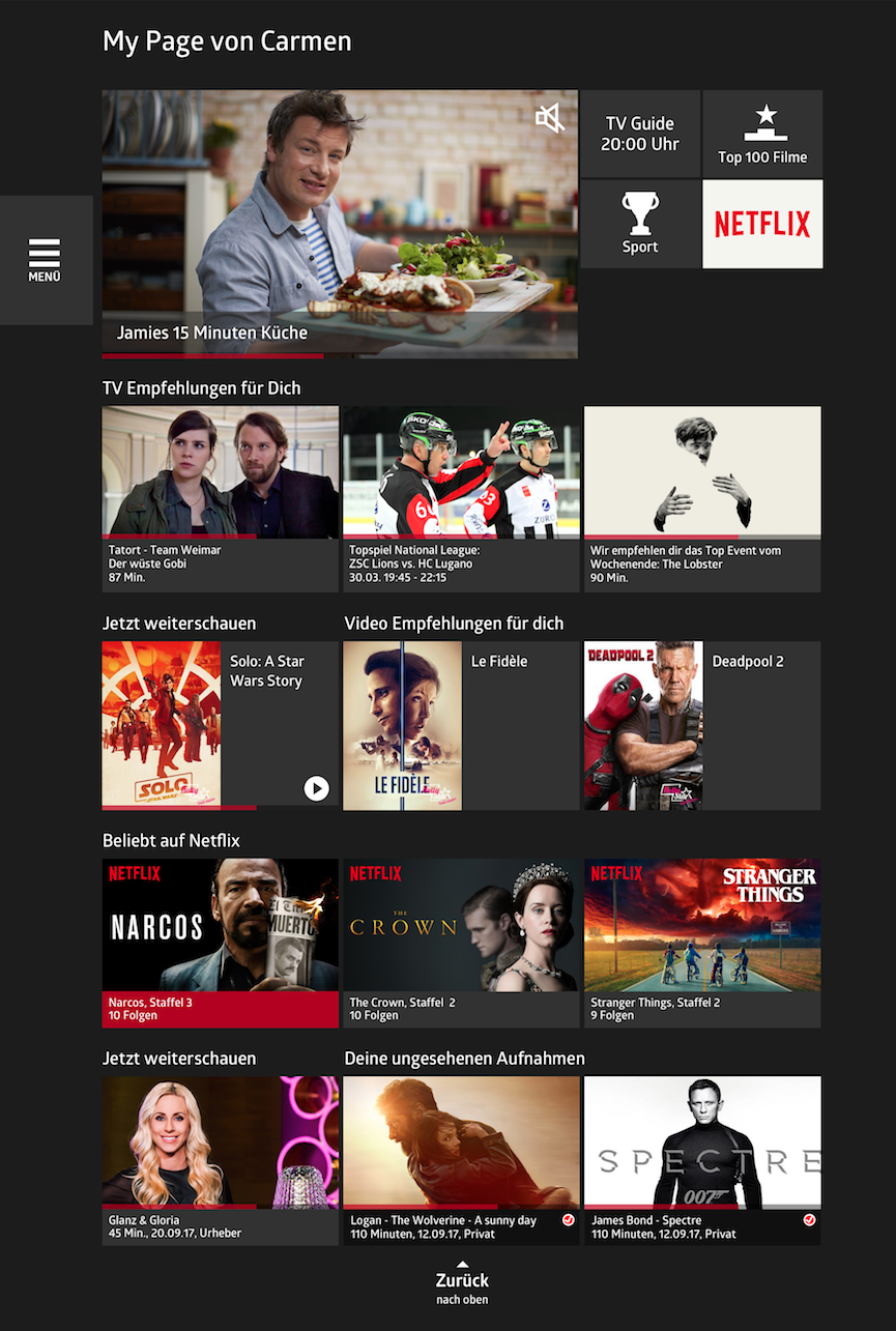 Im grössten Abo sind bis zu 1200 Stunden Aufnahmekapazität enthalten. Dies reicht für sehr viele Filme und Serien. Die Aufnahmefunktion ist sehr intuitiv gestaltet. Laufende Sendungen können direkt mit einer Taste auf der Fernbedienung aufgenommen werden. Auch aus dem EPG können Aufnahmen getätigt werden. Dabei spielt es keine Rolle, ob die Sendung bereits ausgestrahlt wurde oder erst in Zukunft erscheint. Bei TV-Serien ist es jeweils möglich nur die angezeigte Episode oder automatisch die ganze Staffel aufzunehmen. Die Anzeige der bereits aufgenommenen Sendungen ist übersichtlich gestaltet. Einzelne Episoden einer Serie werden gruppiert angezeigt. Es stehen Sortiermöglichkeiten wie nach Datum oder Alphabet zur Verfügung. Die Sendungen lassen sich auch filtern, wie z.B. bereits gesehene Inhalte oder aus verschiedenen Zeiträumen.