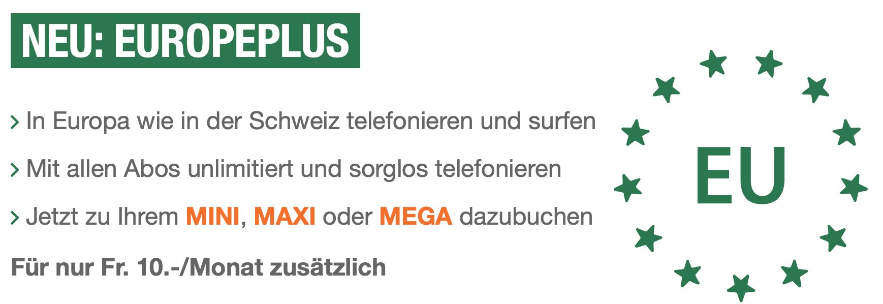 Die neue Option ist für die aktuellen Abos «Mini», «Maxi» und «Mega» verfügbar. Mit der Option kann in der EU unlimitiert telefoniert werden. Dabei sind ankommende und Anrufe aus dem Ausland in die Schweiz, wie auch Anrufe aus dem einen in das andere EU-Land inbegriffen. Je nach Abo sind die 600 MB, 3 oder 5 GB auch in der EU gültig. Zudem sind auch alle SMS/MMS aus dem Ausland in die Schweiz inbegriffen.