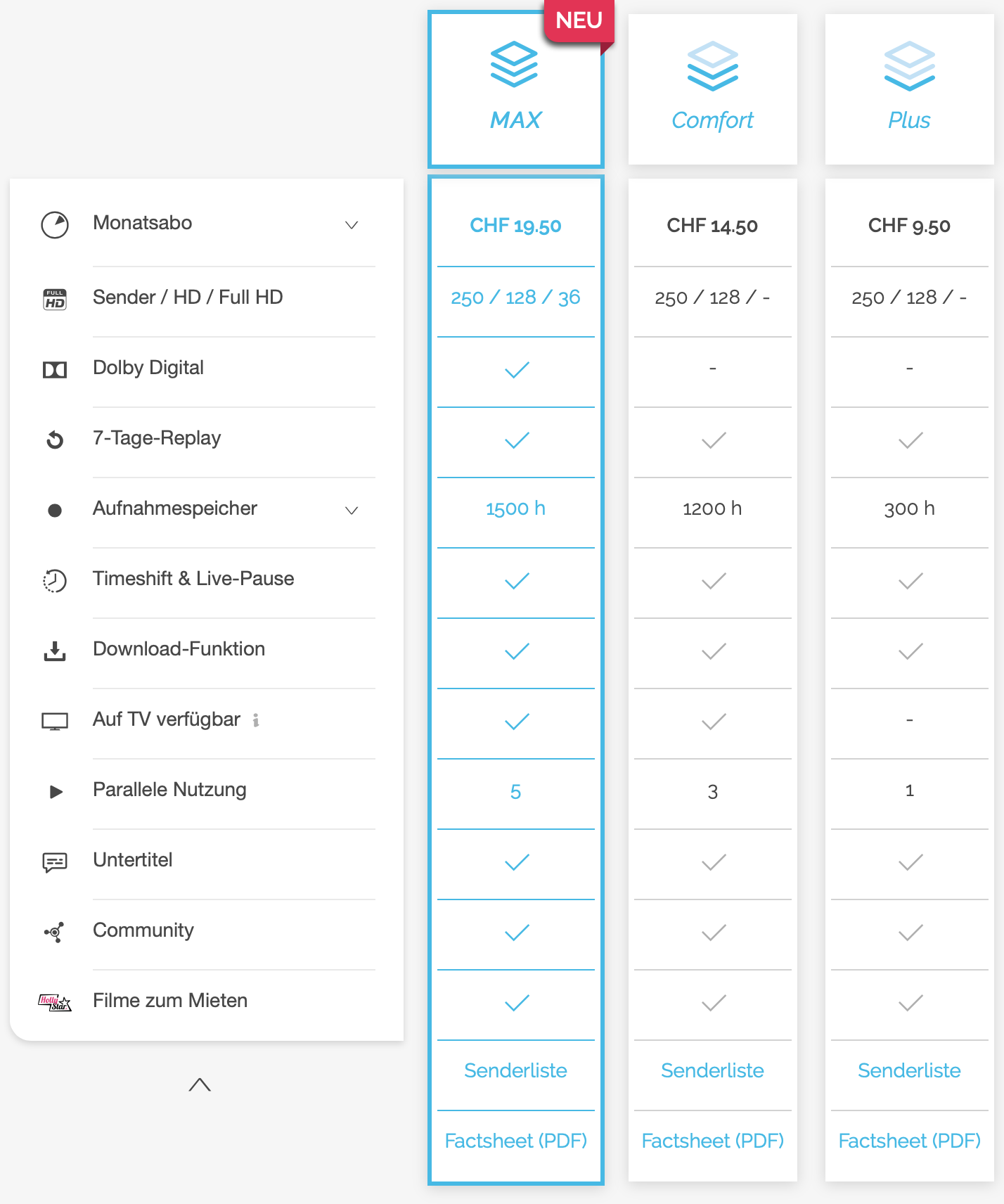 Der TV- und Internet-Anbieter Teleboy hat mit «Teleboy Max» ein neues TV-Abo lanciert. «Teleboy Max» enthält 250 TV-Sender, 96 davon in HD, 36 in Full HD und unterstützt Dolby Digital. Der Aufnahmespeicher wurde von 1200 auf 1500 Stunden erhöht, neu mit unbegrenzter Speicherdauer. Als Einzelangebot kostet dieses Abo monatlich CHF 19.50.