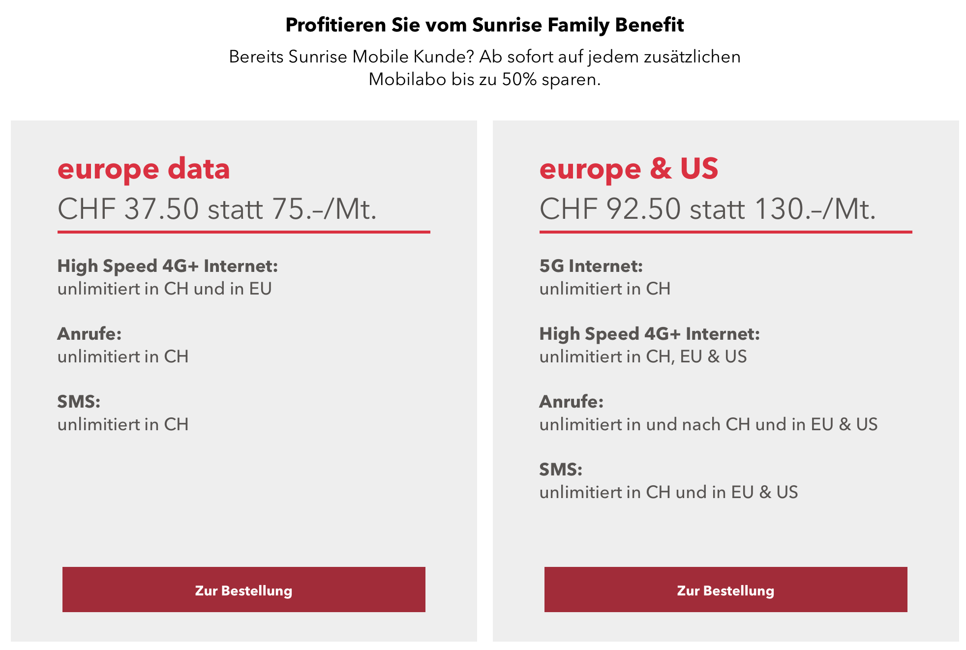 Bisher galt bei Sunrise ein Kombirabatt von 10% auf alle Grundgebühren im selben Haushalt. Voraussetzung war, dass mindestens ein Festnetz-Internet abonniert wurde. Neu wurde der Rabatt für die zwei teureren Handy-Abos erhöht. Sofern bereits ein Handy-Abo mit unlimitierten Daten besteht, gelten für die weiteren Handy-Abos die folgenden Preise: