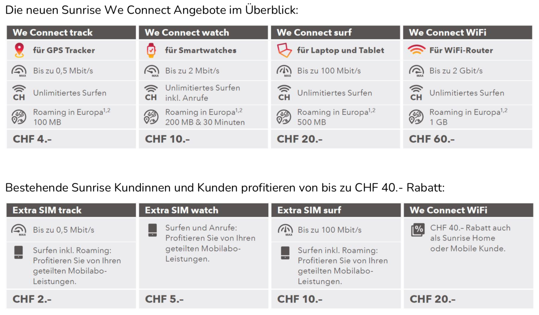 «We Connect WiFi» mit unlimitiertem Internet mit bis zu 2 Gbit/s auf dem 5G-Netz für CHF 60.- ersetzt. Somit werden diese Angebote für Nicht-Sunrise-Kundinnen und -Kunden teurer.