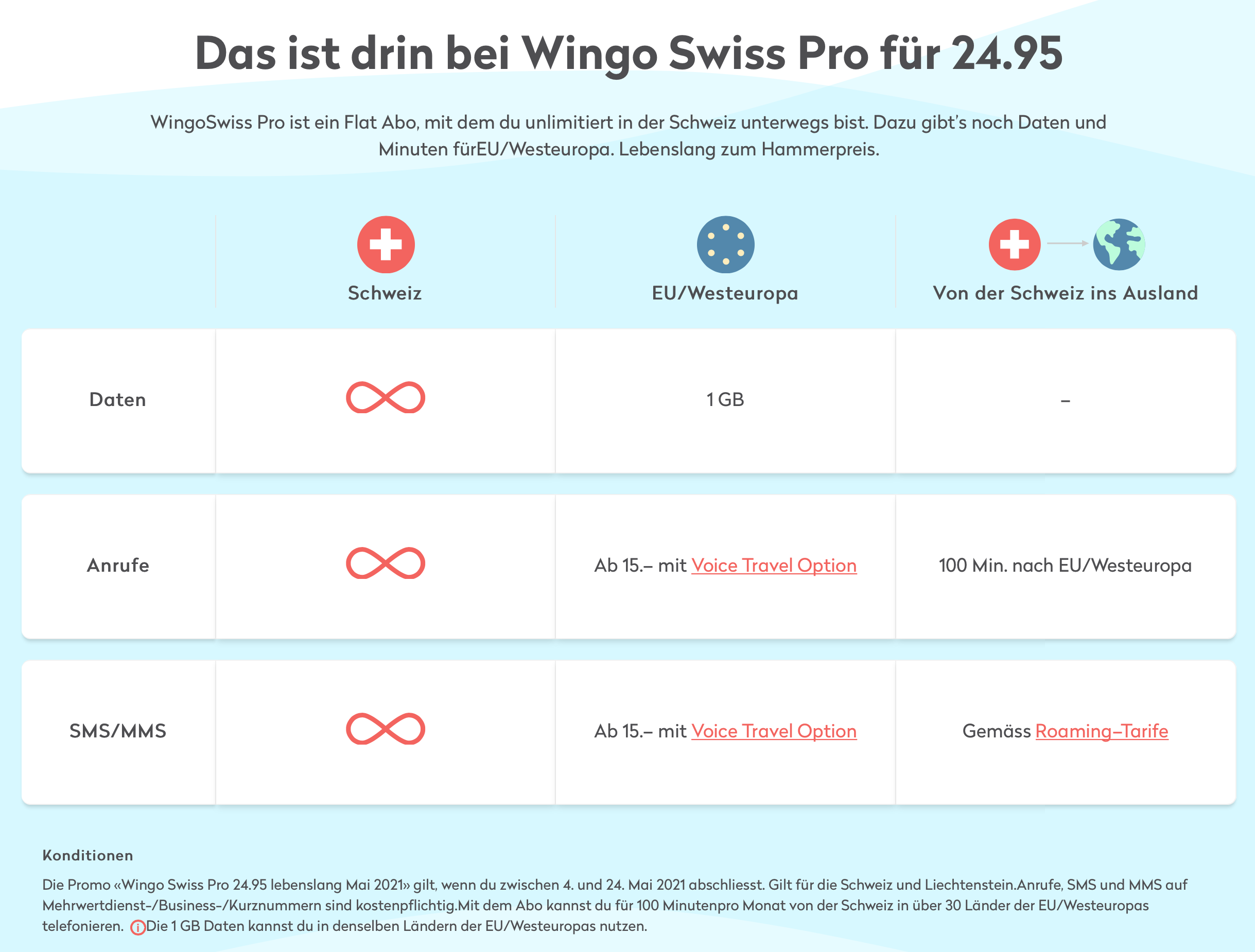 Nachdem Wingo bereits letzte Woche ein neues Internet-Abo für zuhause lanciert wurde, ist ab heute ein neues Handy-Abo erhältlich. Wingo Swiss Pro enthält unlimitierte Nutzung innerhalb der Schweiz, 100 Telefonieminuten aus der Schweiz ins EU-Ausland, sowie 1 GB in der EU.