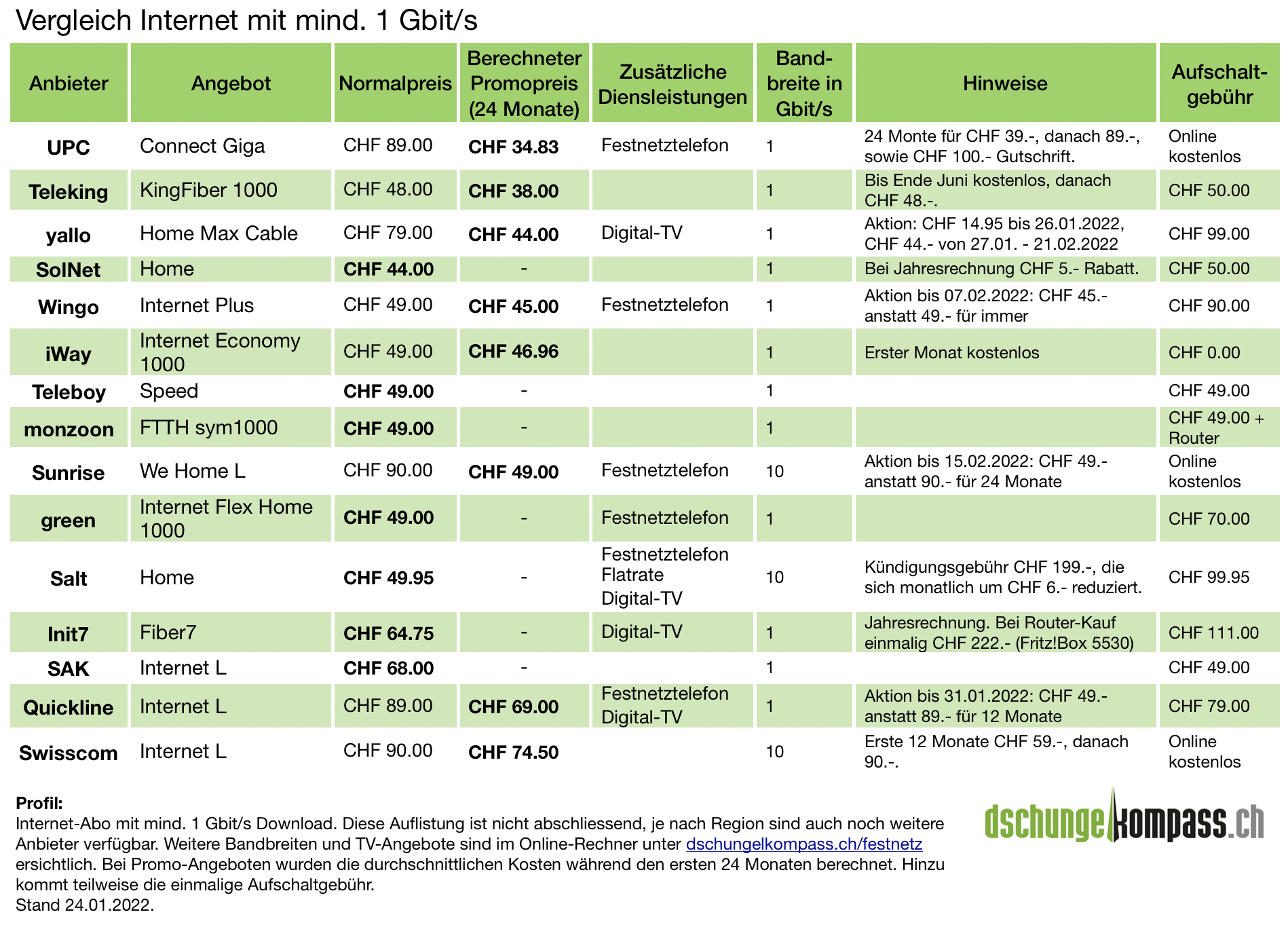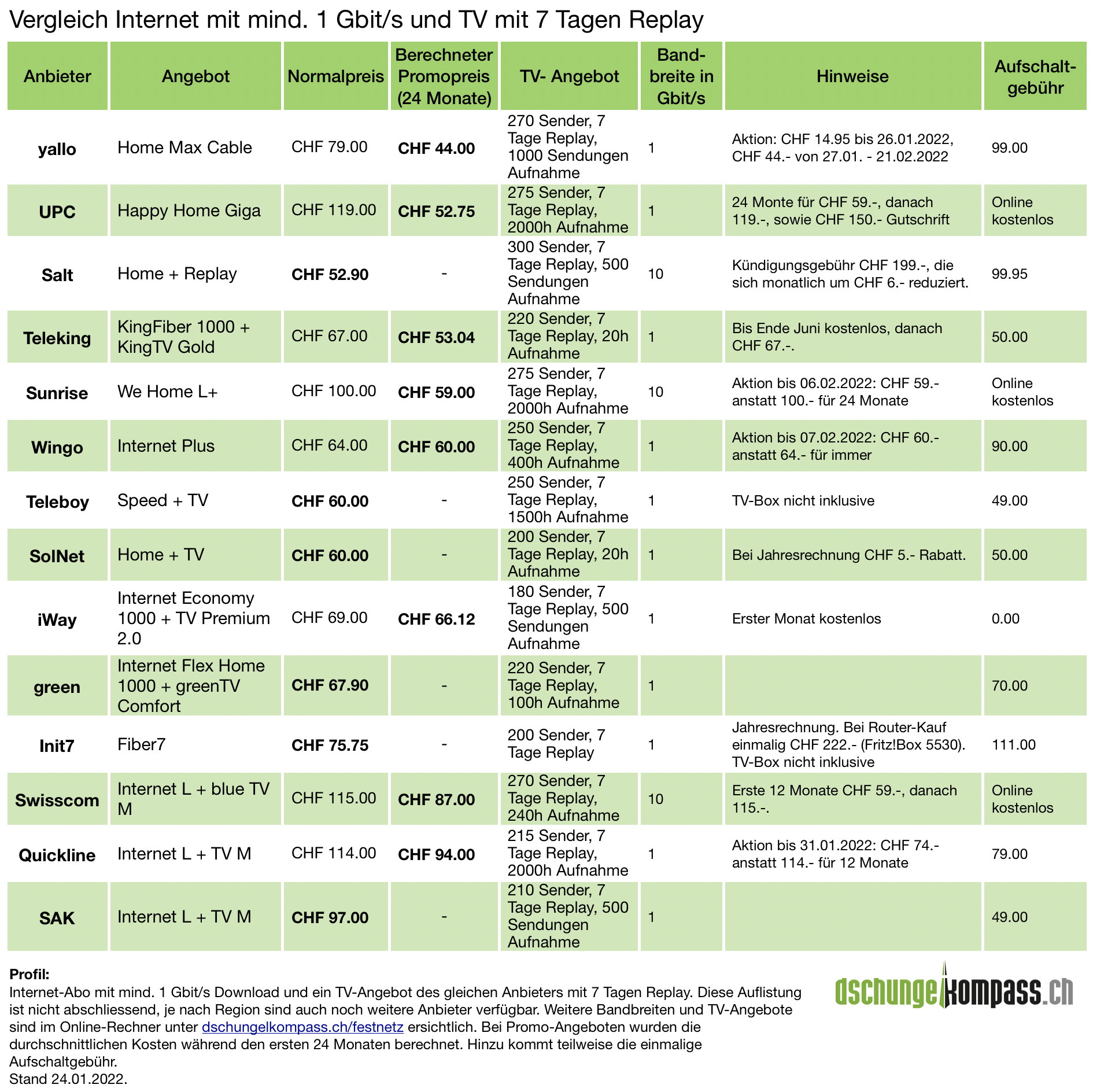 «Der Einführungspreis von CHF 14.95 ist der absolut günstigste für Gigabit-Internet, den ich je gesehen habe.», sagt Oliver Zadori von dschungelkompass. Da dieser aber nur während den ersten zwei Tagen erhältlich ist, wurde er für den nachfolgenden Preisvergleich nicht zusätzlich berücksichtigt. Wie ein aktueller Preisvergleich von dschungelkompass.ch zeigt, ist aber auch der nächste Aktionspreis von CHF 44.- derzeit einer der günstigsten für Gigabit-Internet und der günstigste für Kombi-Angebote mit TV.