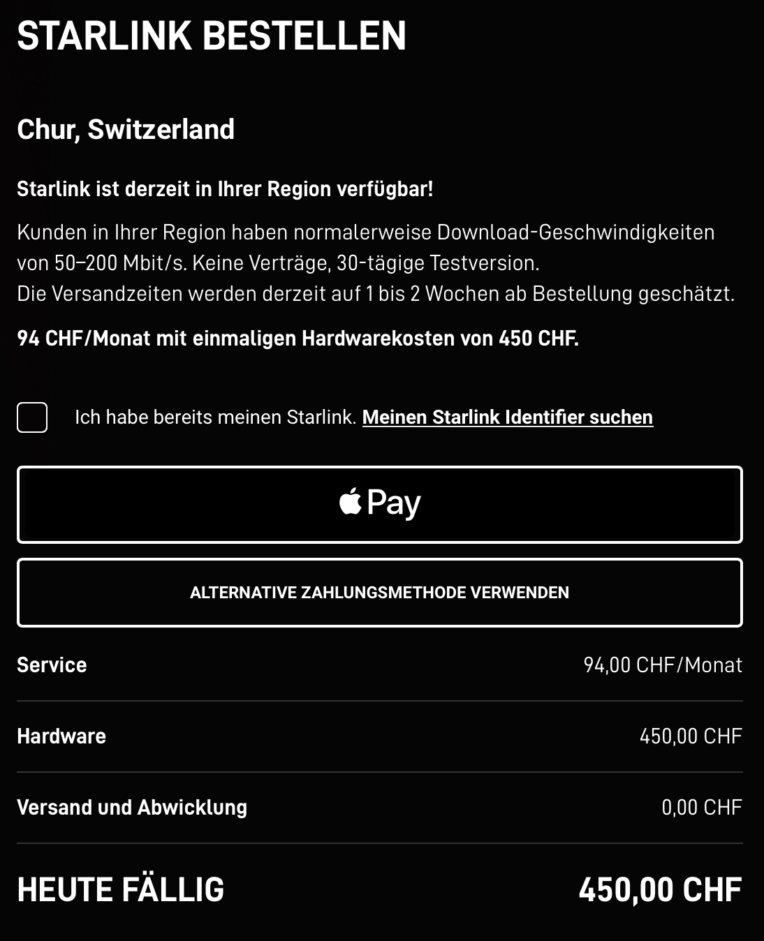 Ein Internet-Abo von Starlink kostet monatlich CHF 94.-. Dazu kommen einmalige CHF 450.- für die benötigte Bodenstation. Gemäss Webseite sollten derzeit an diversen Orten der Schweiz rund 50-200 Mbit/s verfügbar sein: