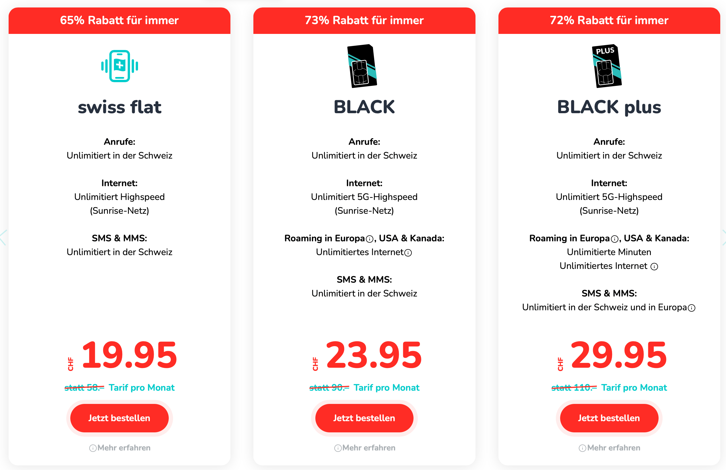 Bei Sunrise erhöhen sich die Preise auf die Grundgebühren um 4%. Wenn ein Abo derzeit CHF 50.- kostet, beträgt der neue Preis CHF 52.-. Falls das Abo mit einem Aktionsrabatt von 50% abonniert wurde, beträgt der neue Preis nun CHF 26.- anstatt 25.-.