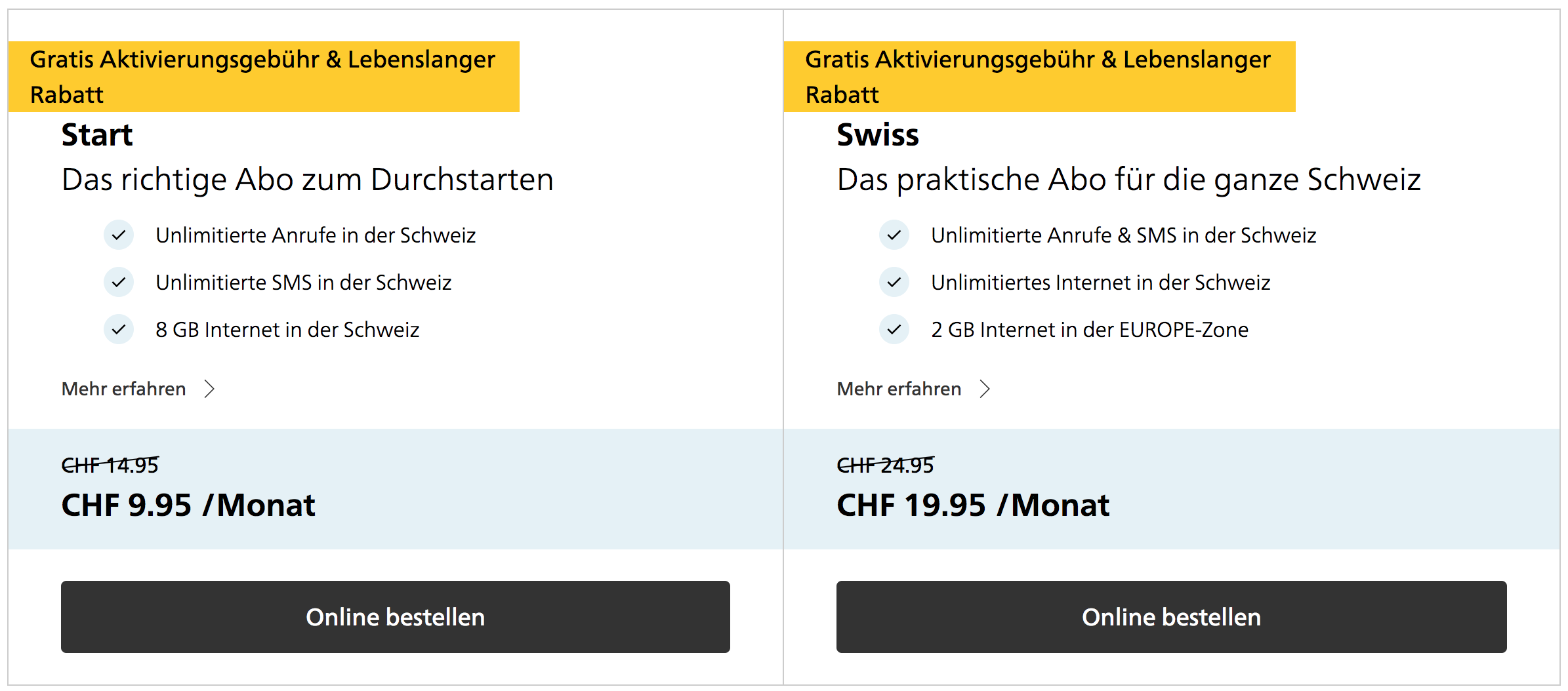 Die ersten drei Abos «Start», «Swiss» und «Europe» sind bis zum 7. März 2024 mit einer Einführungsaktion erhältlich. Dabei gibt es lebenslang CHF 5.- Rabatt pro Monat. Zudem ist in diesem Zeitraum die Aufschaltgebühr kostenlos (anstatt CHF 49.95). Mehr Infos zur Aktion sind auf der Aktionsseite zu finden.