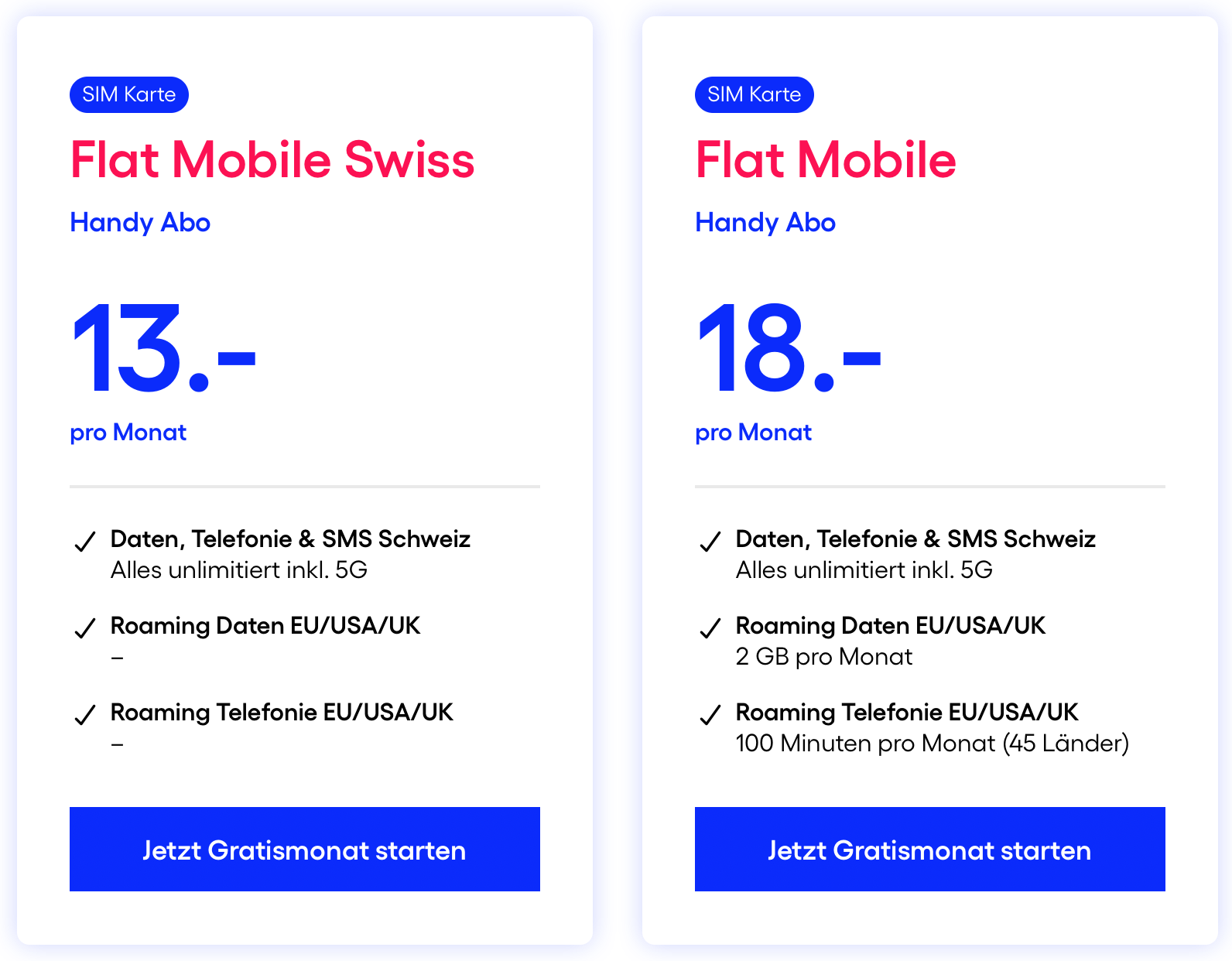 Das bisherige «Flat Mobile» ist weiterhin für CHF 18.- erhältlich. Neu hinzugekommen sind 100 Gratisminuten für Roaming innerhalb der EU und USA, sowie für Anrufe aus der Schweiz in diese Länder. Neu kann mit diesem Abo auch die volle 5G-Geschwindigkeit genutzt werden. Bisher wurde die Bandbreite auf 30 Mbit/s gedrosselt. Weiterhin sind 2 GB Roaming-Datenvolumen in der EU und USA enthalten.