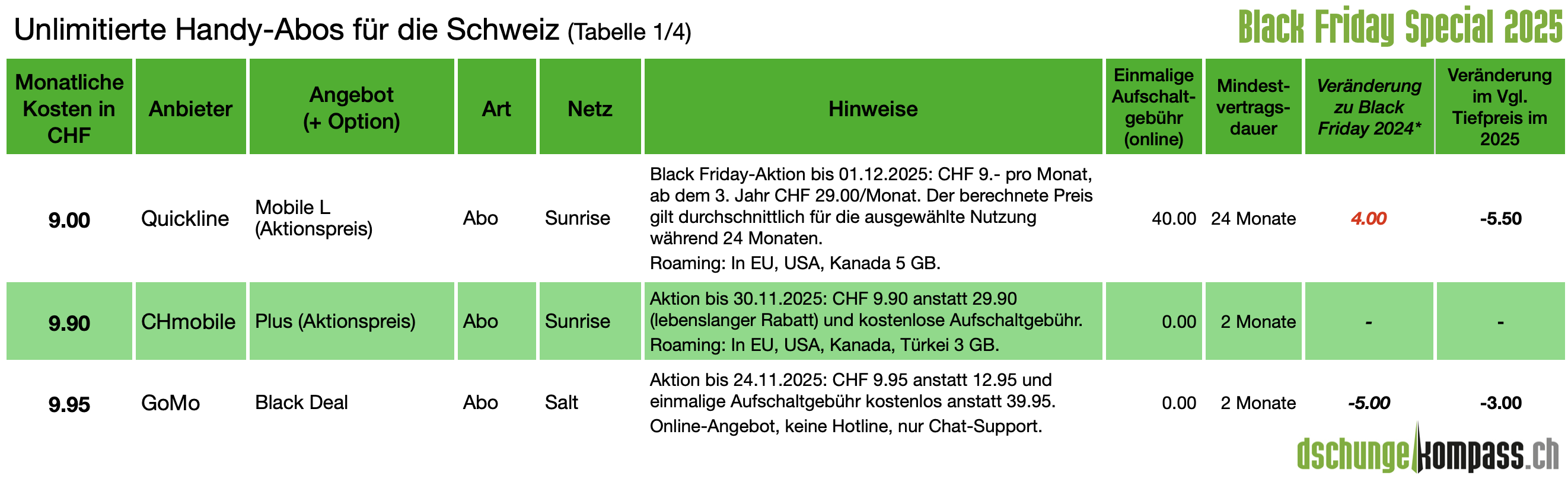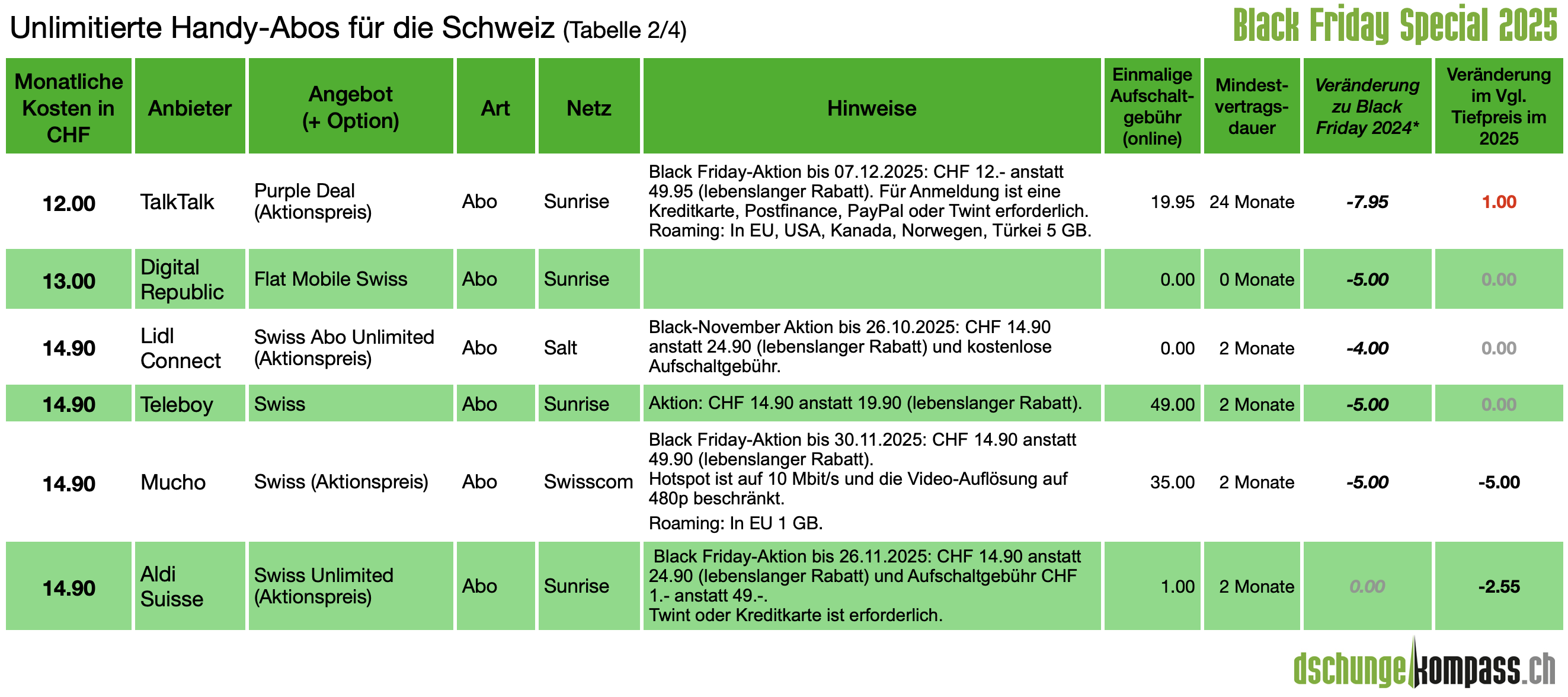 Die zweitletzte Spalte der Tabelle stellt den Preisunterschied im Vergleich zum letztjährigen Black Friday dar und die letzte Spalte den Preisunterschied zum niedrigsten Aktionspreis für ein Inland-Flatrate-Abo des jeweiligen Anbieters des aktuellen Jahres. Dabei ist jedoch Vorsicht geboten: Die zugrunde liegenden Abos können sich unterscheiden und teilweise zusätzliche Leistungen wie Roaming enthalten.