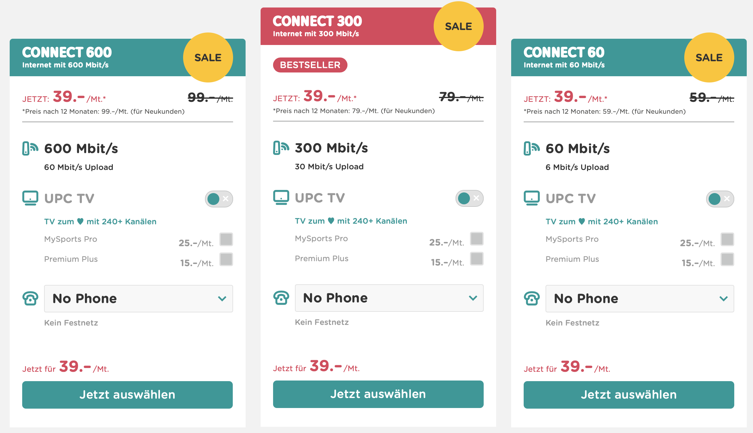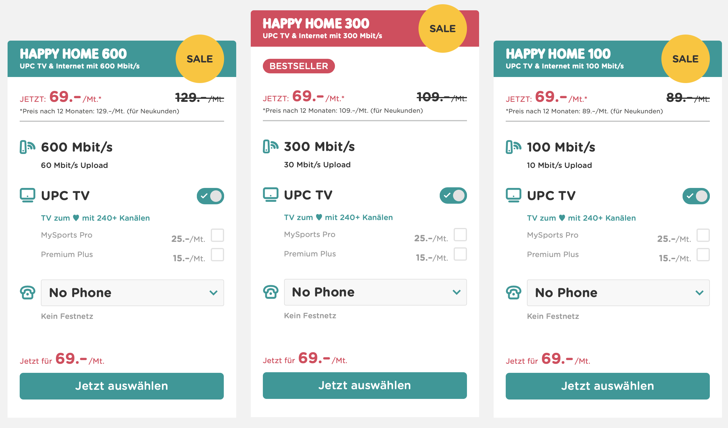 UPC gewährt auf Neuabschlüsse von Connect und Happy Home einen Aktionspreis. Bei Neuabschluss eines Internet-Abos sind die ersten 12 Monate für CHF 39.- erhältlich. Die Kombiabos für Internet und TV kosten CHF 69.-. Die Mindestvertragsdauer beträgt 12 Monate.