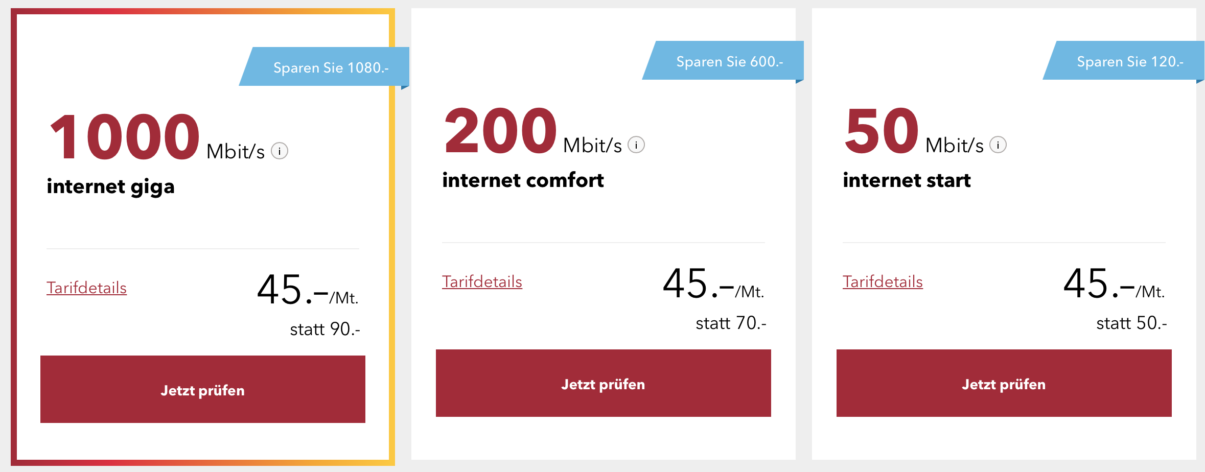Sunrise gewährt auf Neuabschlüsse von Sunrise Home Internet einen Aktionspreis. Bei Neuabschluss eines Internet-Abos «Start», «Comfort» und «Giga» sind die ersten 24 Monate für CHF 45.- erhältlich. Die Mindestvertragsdauer für diesen Promopreis beträgt 24 Monate.