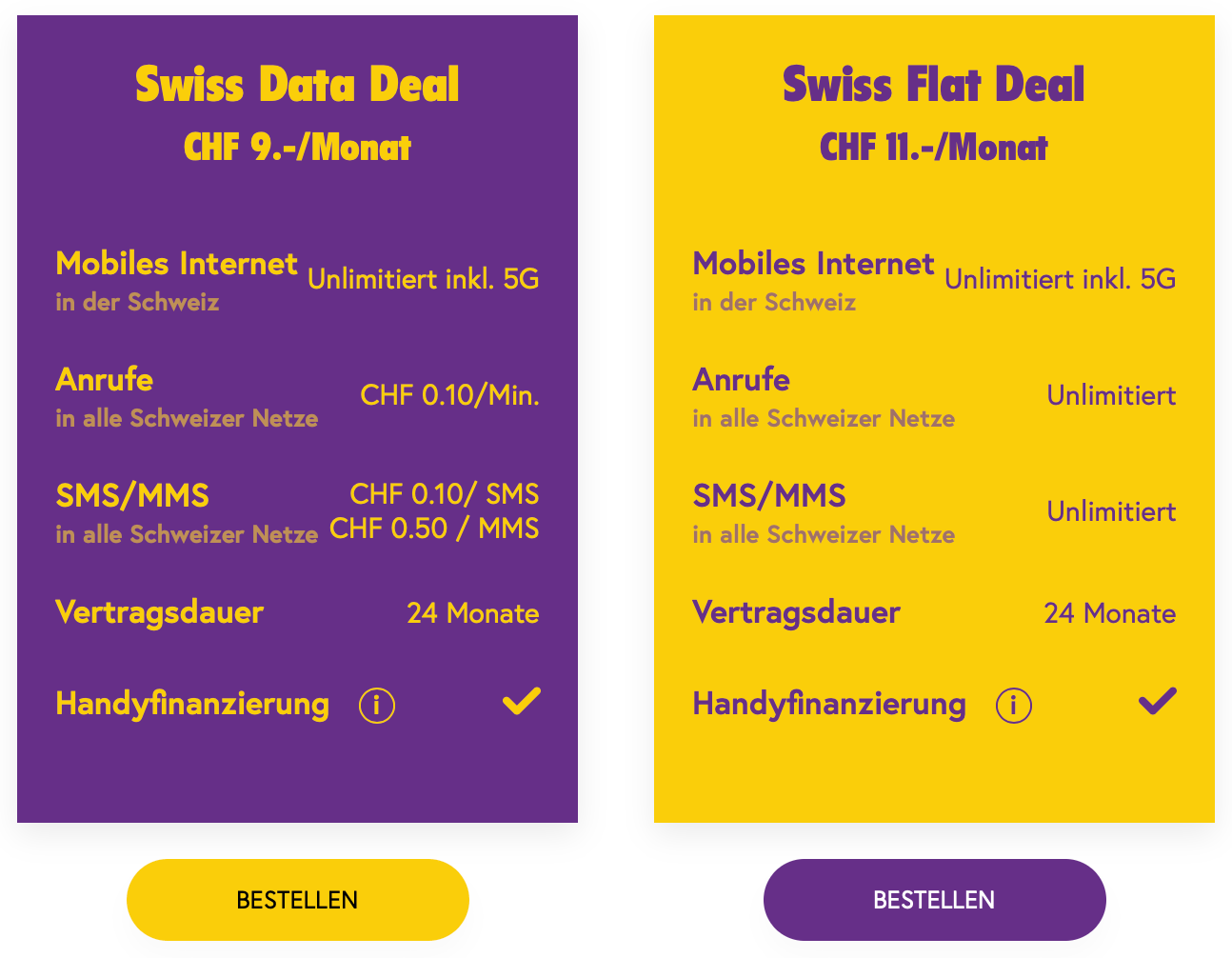 Zum Black Friday 2021 gibt es bei TalkTalk zwei spezielle Abos, die sonst nicht erhältlich sind. Das sind «Data Deal» für CHF 9.- und «Swiss Deal» für CHF 11.-. Die Mindestvertragsdauer beträgt 24 Monate, der Rabatt gilt so lange das Abo behalten wird. Hinzu kommt die einmalige Aufschaltgebühr von CHF 19.95. Für die Online-Bestellung ist eine Kreditkarte, Postfinance oder Twint erforderlich.